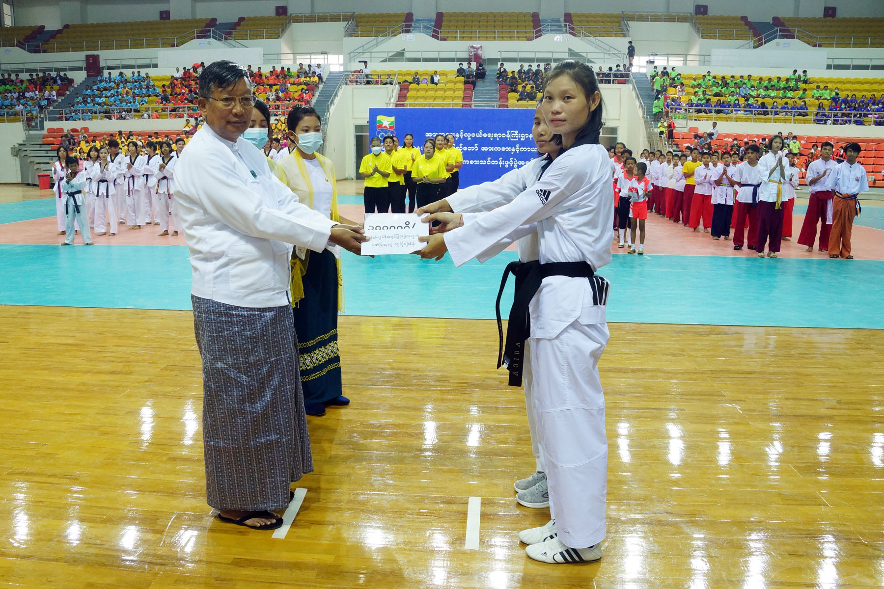 `ထို့နောက် နေပြည်တော်ကောင်စီဥက္ကဋ္ဌနှင့် တာဝန်ရှိသူများက အားကစားသရုပ်ပြအဖွဲ့များကို ဂုဏ်ပြုချီးမြှင့် ငွေများနှင့် မြို့နယ်ရှစ်မြို့နယ်အတွက် အားကစားပစ္စည်းများကို ထောက်ပံ့ပေးအပ်ရာ သရုပ်ပြအဖွဲ့များနှင့် သက်ဆိုင်ရာမြို့နယ်များမှ တာဝန်ရှိသူများက လက်ခံရယူကြပြီး နေပြည်တော်ကောင်စီဥက္ကဋ္ဌနှင့် တာဝန်ရှိသူ များက သင်တန်းသား/ သင်တန်းသူများကို ရင်းရင်နှီးနှီး လိုက်လံနှုတ်ဆက်သည်။