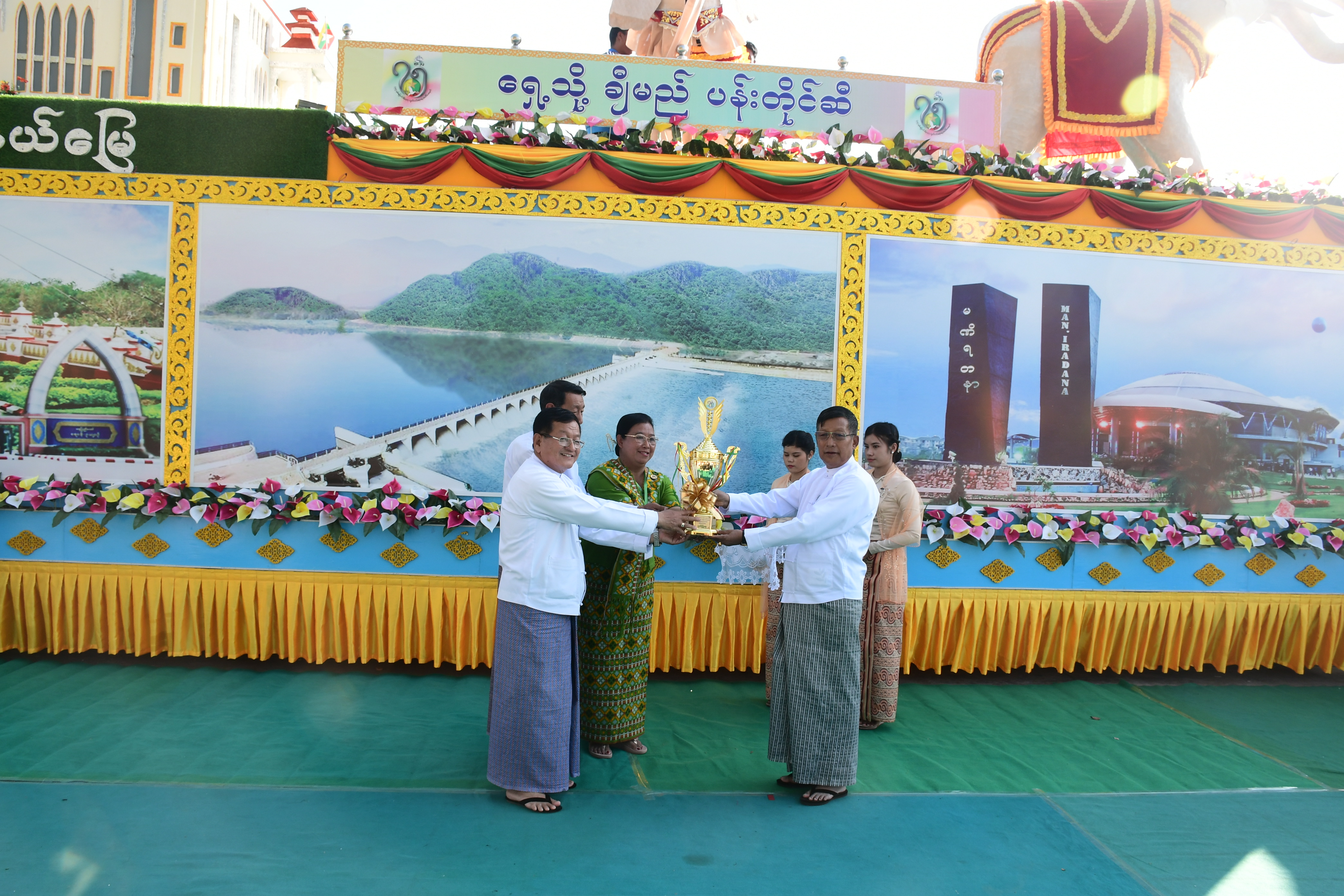 ဦးစွာ (၇၅)နှစ်မြောက် အထိမ်းအမှတ်ပြခန်းများ စီစဉ်ဆောင်ရွက်ရေးလုပ်ငန်း ကော်မတီဥက္ကဋ္ဌ၊ နေပြည်တော်ကောင်စီဥက္ကဋ္ဌ ဦးတင်ဦးလွင်က နေပြည်တော်ကိုယ်စားပြု ဂုဏ်ပြုယာဉ် တည်ဆောက်ရေးဆပ်ကော်မတီကို ဂုဏ်ပြုယာဉ် အထူးဆုတံဆိပ်၊ (၇၅)နှစ် မြောက် စိန်ရတုလွတ်လပ်ရေးနေ့ အထိမ်းအမှတ်ပြခန်းများဆောက်လုပ်ရေး ဆပ်ကော်မတီ နှင့် ဖွင့်ပွဲအခမ်းအနားကျင်းပရေးဆပ်ကော်မတီကို ဂုဏ်ပြုဆုတံဆိပ်၊ အထိမ်းအမှတ် ပြခန်းများ ဆောက်လုပ်ရေးဆပ်ကော်မတီနှင့် နေပြည်တော်ကိုယ်စားပြုဂုဏ်ပြုယာဉ် တည်ဆောက်ရေးဆပ်ကော်မတီအား နိုင်ငံတော်စီမံအုပ်ချုပ်ရေးကောင်စီ၏ ဂုဏ်ပြုဆု ငွေကျပ်သိန်း(၁၀၀)၊ အထိမ်းအမှတ်ပြခန်းများ ဆောက်လုပ်ရေးဆပ်ကော်မတီနှင့် နေပြည် တော်ကိုယ်စားပြုဂုဏ်ပြုယာဉ် တည်ဆောက်ရေးဆပ်ကော်မတီအား ဂုဏ်ပြုဆုငွေကျပ် (၂၅)သိန်းတို့ကို ချီးမြှင့်ရာ ဆောက်လုပ်ရေးဝန်ကြီးဌာန၊ ဒုတိယဝန်ကြီး ဦးဝင်းဖေ၊ နေပြည်တော်ကောင်စီအဖွဲ့ဝင် ဦးမြင့်စိုး၊ နေပြည်တော်စည်ပင် သာယာရေးကော်မတီ ဒုတိယ မြို့တော်ဝန် ဦးမောင်မောင်၊ နေပြည်တော်စည်ပင် သာယာရေးကော်မတီ အမြဲတမ်း အတွင်းဝန် ဦးမျိုးအောင်နှင့် နေပြည်တော်လမ်းဦးစီးဌာန ညွှန်ကြားရေးမှူး ဒေါ်နွယ်နီထွန်း တို့က လက်ခံရယူကြသည်။