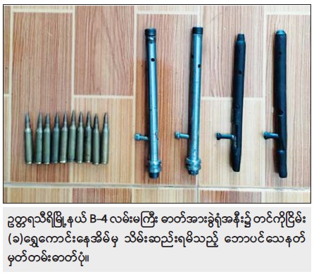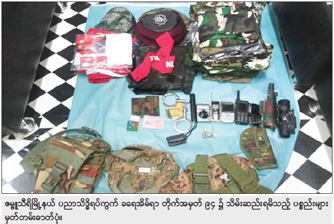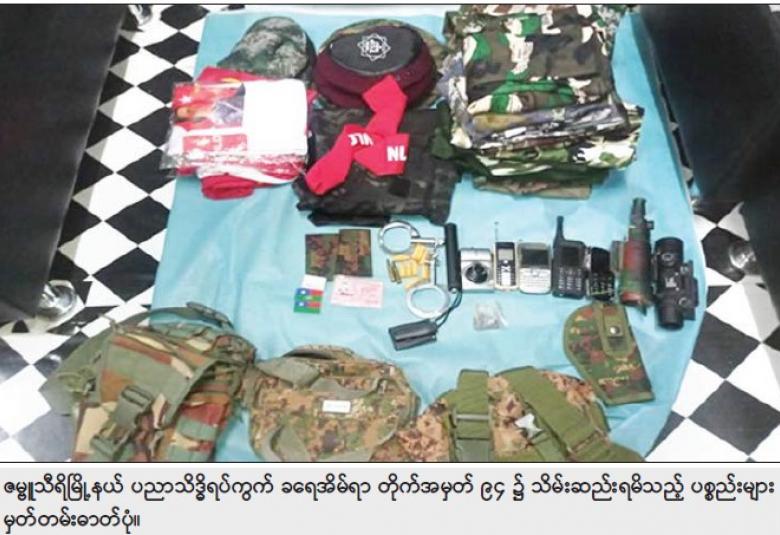 ဖြစ်စဉ်တွင် ဖမ်းဆီးရမိတရားခံ ကျား လေးဦးကို လက်လုပ်သေနတ် လေးလက်၊ ၅ ဒသမ ၅၆ ကျည် ၁၀ တောင့်၊ လက်လုပ်မိုင်း နှစ်လုံး၊ ပြောက်ကျား ယူနီဖောင်း/ ဂျာစီများ၊ NLD ပါတီတံဆိပ်ပါ အင်္ကျီများနှင့်အတူ ဖမ်းဆီးရမိခဲ့သည်။