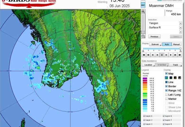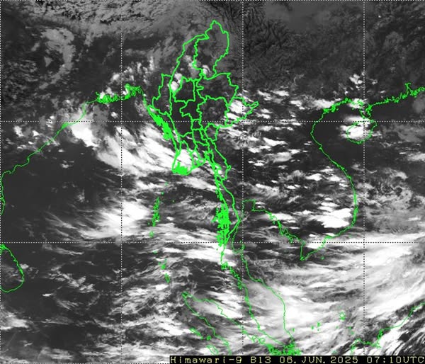 မိုးတိမ်တောင်ဖြစ်ပေါ်မှုအခြေအနေ။ ရန်ကုန်တိုင်းဒေသကြီး၊ ဧရာဝတီတိုင်းဒေသကြီး၊ တနင်္သာရီတိုင်းဒေသကြီး၊ မွန်ပြည်နယ်နှင့် ရှမ်းပြည်နယ်(အရှေ့ပိုင်း) တို့တွင် မိုးတိမ်တောင်များ ဖြစ်ထွန်းလျက်ရှိပြီး၊ အဆိုပါ မိုးတိမ်တောင်များ ရွေ့လျားရာနေရာတစ်လျှောက်တွင် မိုးရွာသွန်းခြင်းနှင့်အတူ လေပြင်းတိုက်ခတ်ခြင်း၊ မိုးထစ်ချုန်းခြင်း၊ မိုးကြိုးပစ်ခြင်း၊ လျှပ်စီးလက်ခြင်းနှင့် မိုးသီးကြွေခြင်းစသည့် မိုးလေဝသဖြစ်စဉ်များ ဖြစ်ပေါ်နိုင်ပါသဖြင့် ကြိုတင်သတိပြု နိုင်ပါရန် အကြံပြုအပ်ပါသည်။