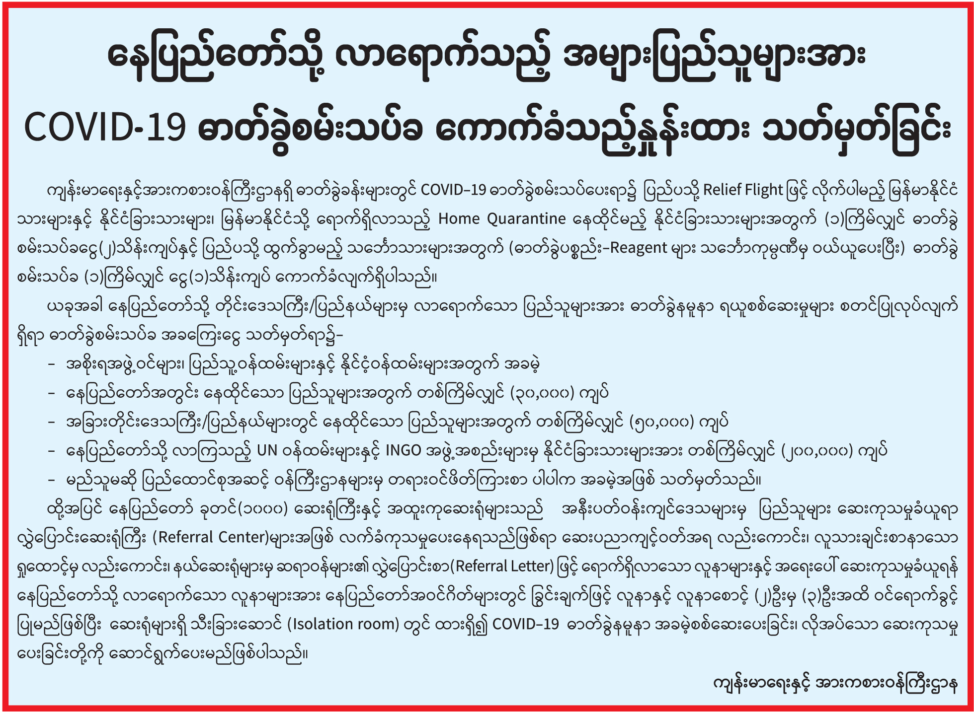 နေပြည်တော်သို့ လာရောက်သည့် အများပြည်သူများအား COVID-19 ဓာတ်ခွဲစမ်းသခ ကောက်ခံသည့်နှုန်းထား သတ်မှတ်ခြင်း