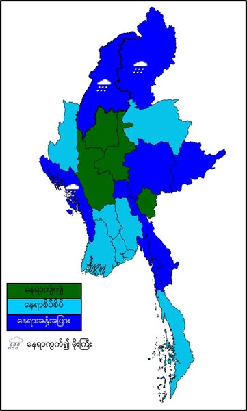 လာမည့်စနေ၊ တနင်္ဂနွေအားလပ်ရက်များအတွက် မိုးလေဝသခန့်မှန်းချက်။ နေပြည်တော်တွင် နေရာအနှံ့အပြား၊ ရန်ကုန်တိုင်းဒေသကြီးတွင် နေရာစိပ်စိပ်နှင့် မန္တလေးတိုင်းဒေသကြီးတွင် နေရာကျဲကျဲ မိုးထစ်ချုန်းရွာမည်။