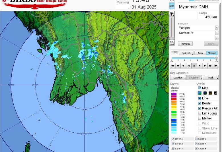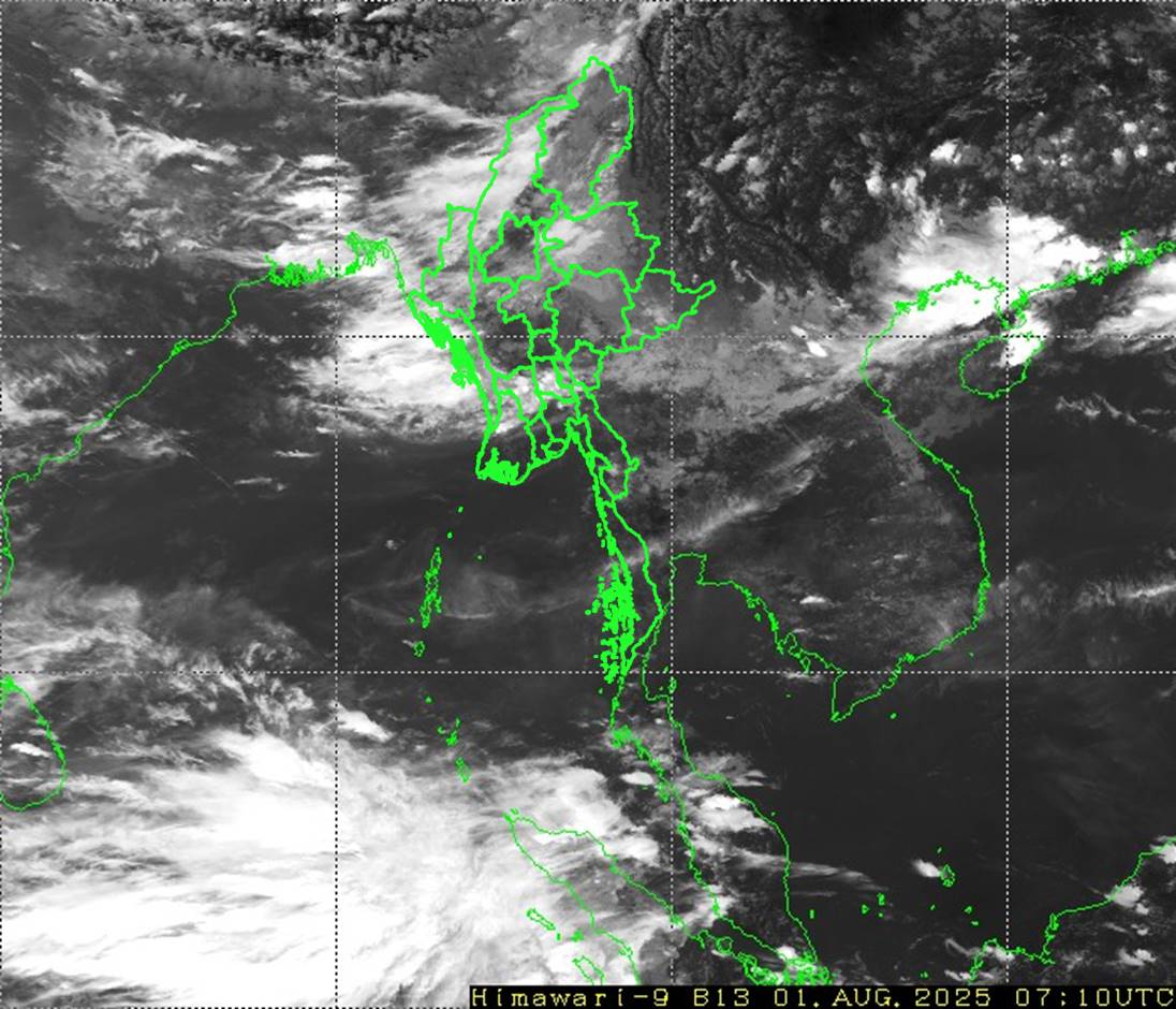 မိုးတိမ်တောင်ဖြစ်ပေါ်မှုအခြေအနေ။ စစ်ကိုင်းတိုင်းဒေသကြီးအထက်ပိုင်း၊ ဧရာဝတီတိုင်းဒေသကြီးနှင့် ရခိုင်ပြည်နယ်တို့တွင် မိုးတိမ်တောင်များ ဖြစ်ထွန်းလျက်ရှိပြီး၊ အဆိုပါ မိုးတိမ်တောင်များ ရွေ့လျားရာနေရာတစ်လျှောက်တွင် မိုးရွာသွန်းခြင်းနှင့်အတူ လေပြင်းတိုက်ခတ်ခြင်း၊ မိုးထစ်ချုန်းခြင်း၊ မိုးကြိုးပစ်ခြင်း၊ လျှပ်စီးလက်ခြင်းနှင့် မိုးသီးကြွေခြင်းစသည့် မိုးလေဝသဖြစ်စဉ်များ ဖြစ်ပေါ်နိုင်ပါသဖြင့် ကြိုတင်သတိပြုနိုင်ပါရန် အကြံပြုအပ်ပါသည်။