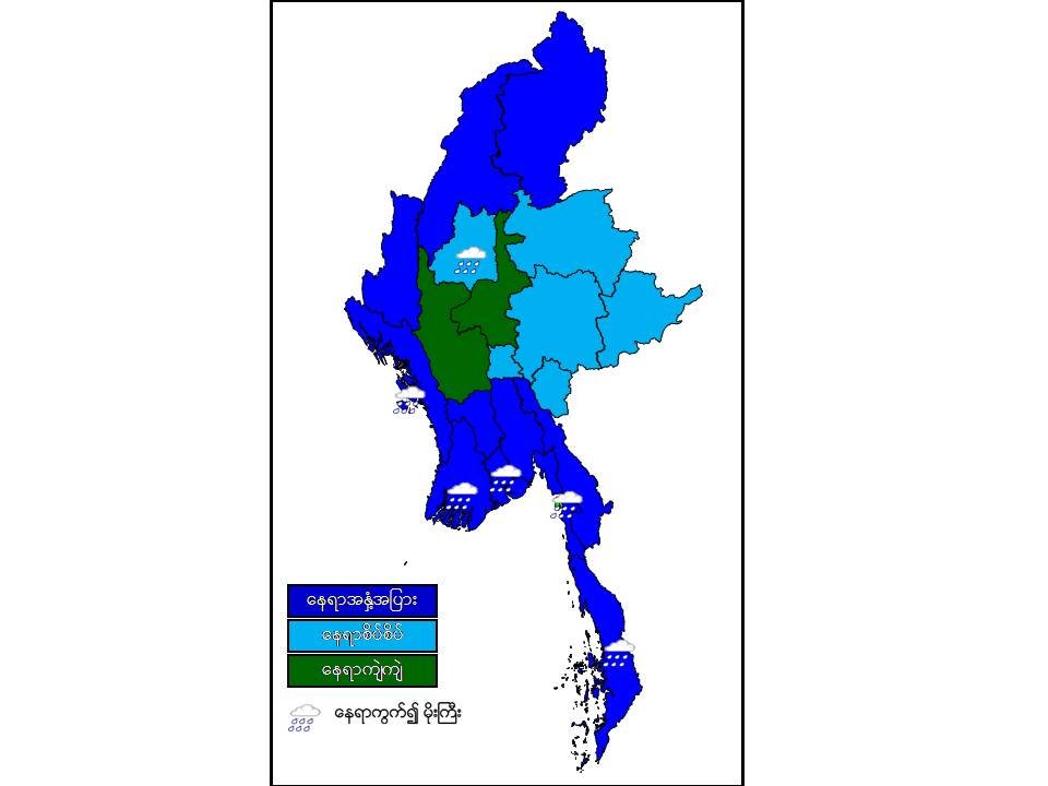 မနက်ဖြန်နံနက်အထိခန့်မှန်းချက်။ မန္တလေးတိုင်းဒေသကြီးနှင့် မကွေးတိုင်းဒေသကြီးတို့တွင် နေရာကျဲကျဲ၊ နေပြည်တော်၊ စစ်ကိုင်းတိုင်းဒေသကြီးအောက်ပိုင်း၊ရှမ်းပြည်နယ်နှင့် ကယားပြည်နယ်တို့တွင် နေရာစိပ်စိပ်နှင့် ကျန်တိုင်းဒေသကြီးနှင့် ပြည်နယ်တို့တွင် နေရာအနှံ့အပြားမိုးထစ်ချုန်းရွာပြီး၊ စစ်ကိုင်းတိုင်းဒေသကြီးအောက်ပိုင်း၊ ရန်ကုန်တိုင်းဒေသကြီး၊ ဧရာဝတီတိုင်းဒေသကြီး၊ တနင်္သာရီတိုင်းဒေသကြီး၊ ရခိုင်ပြည်နယ်နှင့် မွန်ပြည်နယ်တို့တွင် နေရာကွက်၍ မိုးကြီးနိုင်ပါသည်။ ရွာရန်ရာနှုန်းပြည့် ဖြစ်ပါသည်။
