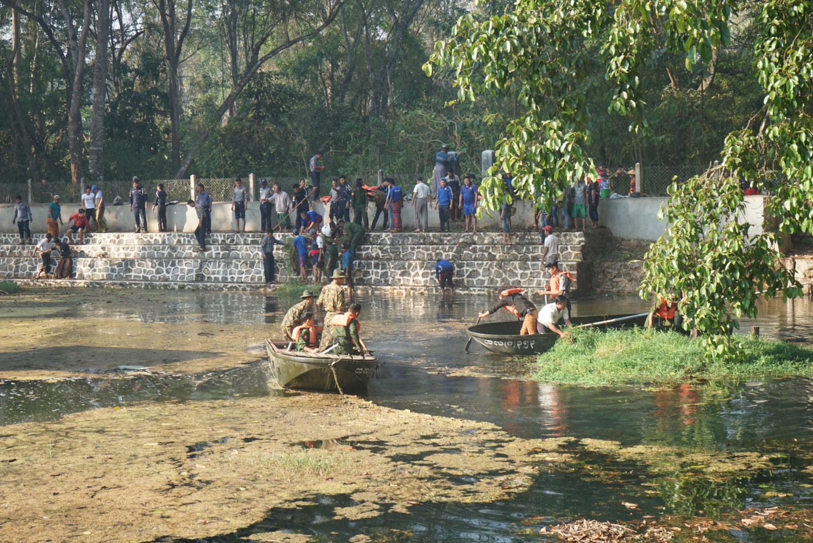 ရှမ်းပြည်နယ်(တောင်ပိုင်း) လင်းခေးခရိုင် မိုးနဲမြို့နယ်တွင် နွေရာသီကာလရေရှားပါးမှုမဖြစ်ပေါ်စေရေးနှင့် ပြည်သူများသန့်ရှင်းသော သောက်သုံးရေလုံလောက်စွာ ရရှိရေးအတွက် မြို့ပေါ်ရပ်ကွက်များသို့ ရေပေးဝေလျက်ရှိသော လွိုင်မြေရပ်ကွက်ရှိ နောင်လုံနတ်ရေကန်နှင့် ဥယျာဉ်ရပ်ကွက်ရှိ နတ်ရေကန် အတွင်းအပြင်ရှိ ပေါင်းမြက်များ ၊သစ်ကိုင်းများ ၊သစ်ရွက်ခြောက်များ ၊ရေမှော်များ ဖယ်ရှားရှင်းလင်းခြင်းကို ယနေ့ နံနက် ၈ နာရီက အဆိုပါရေကန်တို့တွင် စုပေါင်းသန့်ရှင်းရေး ဆောင်ရွက်ခဲ့ကြောင်း သိရသည်။