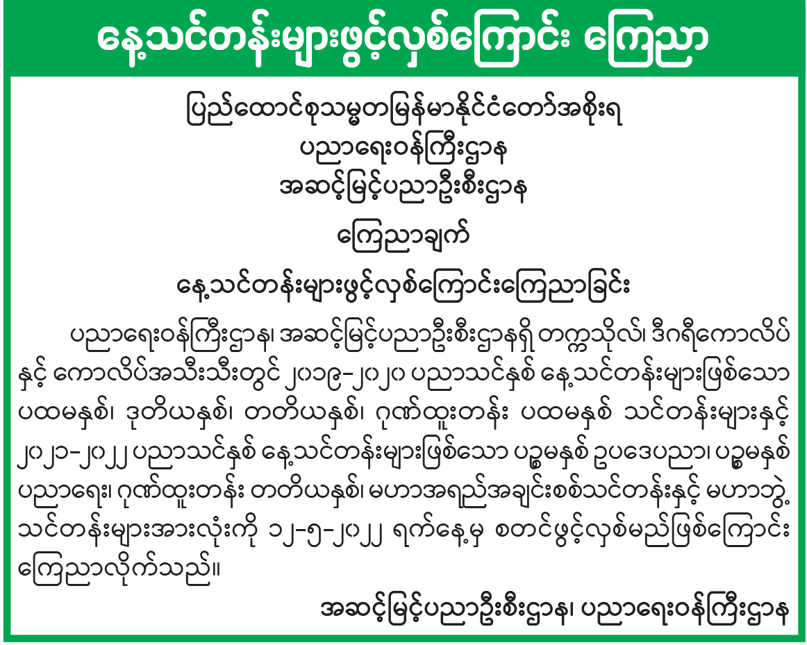 နေ့သင်တန်းများ ၁၂-၅-၂၀၂၂ ရက်နေ့မှ စတင်ဖွင့်လှစ်မည်