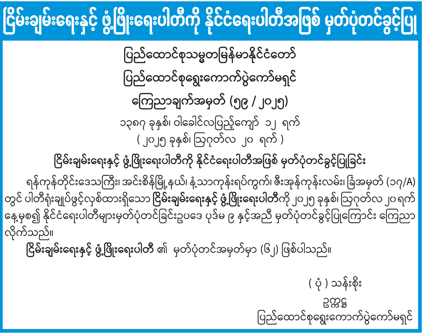 ငြိမ်းချမ်းရေးနှင့် ဖွံ့ဖြိုးရေးပါတီကို နိုင်ငံရေးပါတီအဖြစ် မှတ်ပုံတင်ခွင့်ပြု