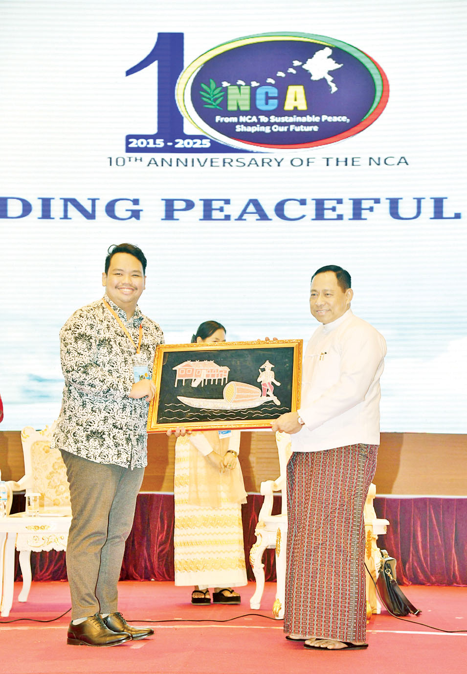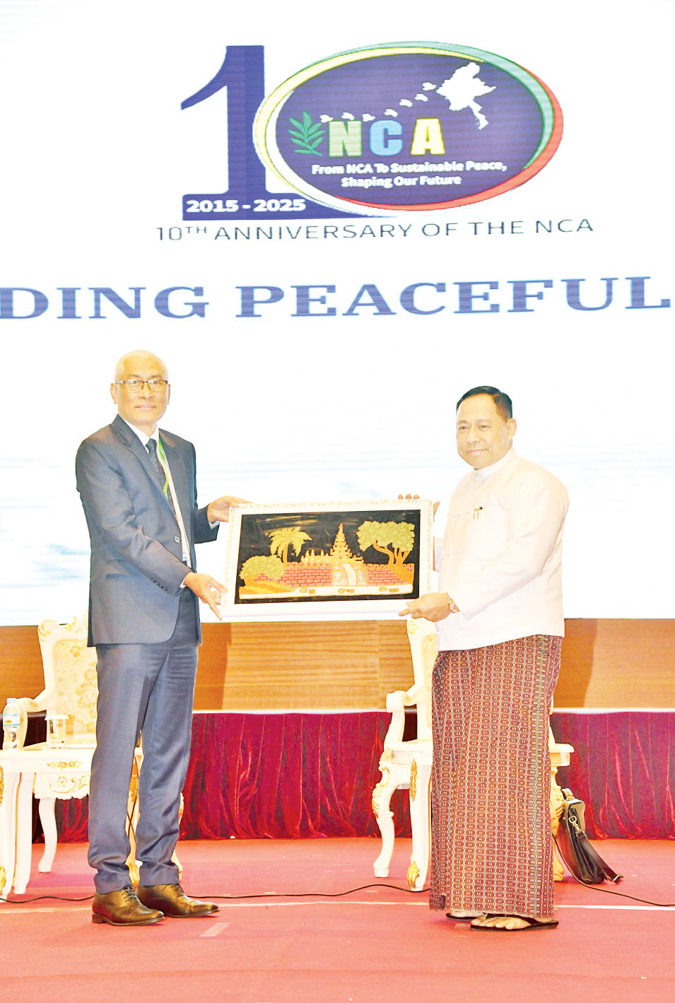 တစ်နိုင်ငံလုံး ပစ်ခတ်တိုက်ခိုက်မှု ရပ်စဲရေးသဘောတူစာချုပ် (NCA)(၁၀)နှစ်ပြည့် နှစ်ပတ်လည်နေ့ အထိမ်းအမှတ် အစီအစဉ်အဖြစ် “ငြိမ်းချမ်းသော မြန်မာ့အနာဂတ်တည်ဆောက်ခြင်း” အလုပ်ရုံဆွေးနွေးပွဲကို နေပြည်တော်ရှိ မြန်မာအပြည်ပြည်ဆိုင်ရာ ကွန်ဗင်းရှင်းဗဟိုဌာန(၁) ကျောက်စိမ်းခန်းမ၌ ဆက်လက်ကျင်းပသည်။