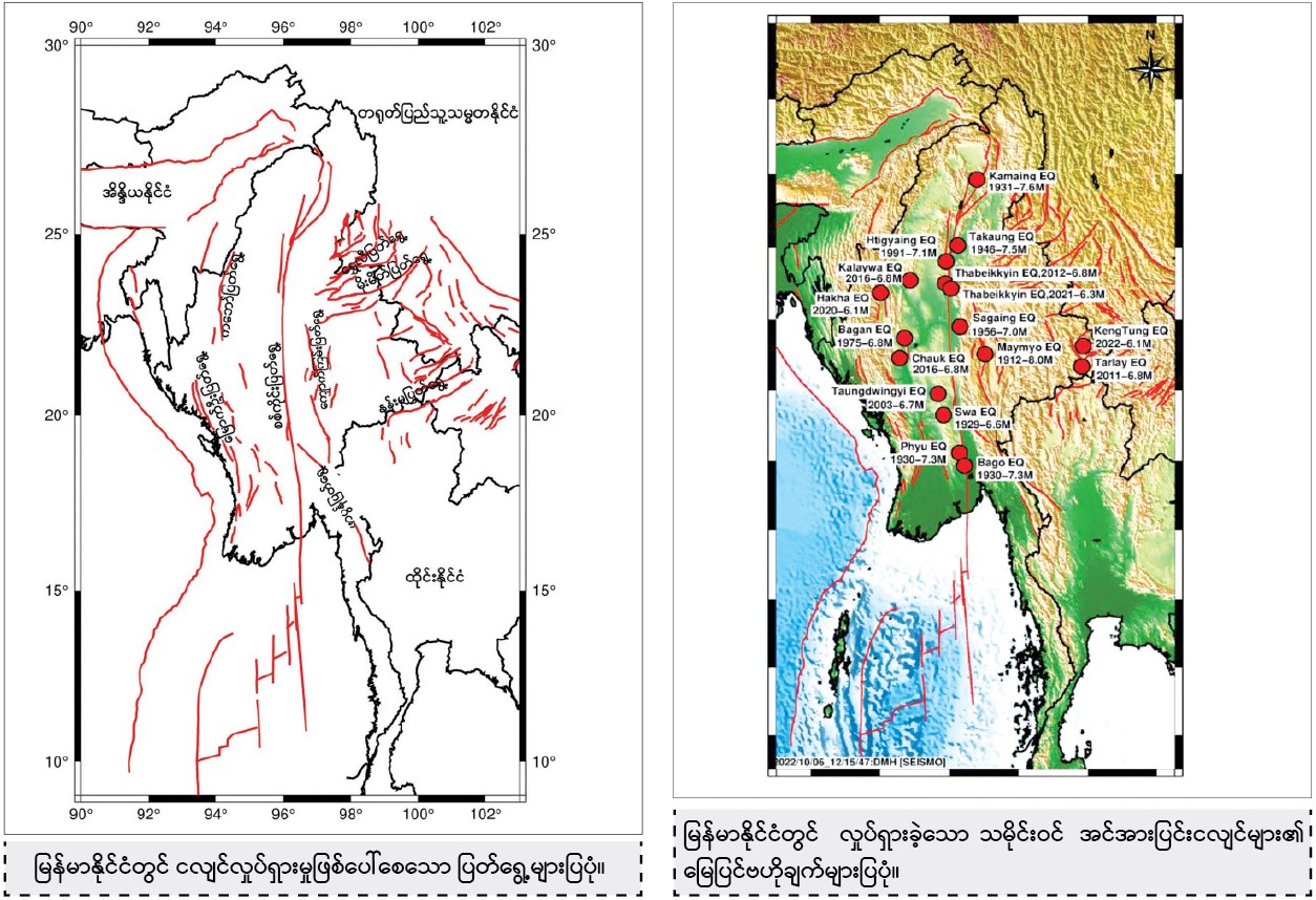 မြန်မာနိုင်ငံသည် ကမ္ဘာတွင်ဖြစ်ပေါ်သော ငလျင်လှုပ်ရှားမှု၏ ၁၅ ရာခိုင်နှုန်းကို ခံစားရသည့် မြေထဲပင်လယ် - ဟိမဝန္တာဇုန်တွင် တည်ရှိနေပြီး မြန်မာနိုင်ငံတွင် ဖြစ်ပေါ်ခဲ့သော ငလျင်များသည် နှောင်းဖြစ် ဘူမိအနေအထားတို့ကြောင့် ဖြစ်ပေါ်ခဲ့ရကာ အထူးသဖြင့် ပြတ်ရွေ့များရှိရာ နေရာများ၌ ငလျင်လှုပ်ရှားမှုများ ဖြစ်ပေါ်ခဲ့ရပါသည်။ မြန်မာနိုင်ငံတွင် ငလျင်လှုပ်ရှားမှုအား ဖြစ်ပေါ်စေသော အဓိကပြတ်ရွေ့ကြီးဖြစ်သည့် စစ်ကိုင်းပြတ်ရွေ့အပြင် ကဘော်ပြတ်ရွေ့၊ ကျောက်ကြမ်းပြတ်ရွေ့၊ မိုးမိတ်ပြတ်ရွေ့၊ နန်းမပြတ်ရွေ့၊ ရွှေလီပြတ်ရွေ့၊ ဖာပွန်ပြတ်ရွေ့၊ မြောက်ဦးပြတ်ရွေ့ စသည့်ပြတ်ရွေ့ များအပြင် ပြတ်ရွေ့ငယ်များစွာ တည်ရှိနေပါသည်။ အဆိုပါပြတ်ရွေ့များ ရွေ့လျားမှုကြောင့် ပြတ်ရွေ့များ တည်ရှိရာဒေသများနှင့် အိန္ဒိယမြေထုချပ်သည် မြန်မာမြေထုချပ်အောက်သို့ တိုးဝင်မှုဖြစ်စဉ် ဖြစ်ပေါ်နေသော မြန်မာနိုင်ငံ အနောက်ဘက်ပိုင်းနှင့် အနောက်မြောက်ပိုင်း ဒေသများတွင် ငလျင်လှုပ်ရှားမှုများဖြစ်ပေါ်လေ့ရှိသဖြင့် အဆိုပါဒေသများတွင် ငလျင်ဘေး အန္တရာယ်အား သတိပြု၍ ကြိုတင်ပြင်ဆင်မှုများ ဆောင်ရွက်ထားသင့်ပါသည်။