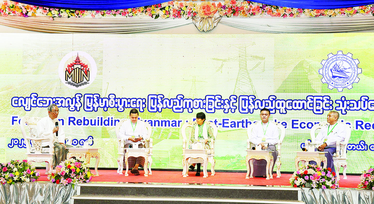ယင်းနောက် “စီးပွားရေးပြန်လည်ထူထောင်ခြင်းအတွက် စိန်ခေါ်မှုများနှင့် အခွင့်အလမ်းများ” ခေါင်းစဉ်ဖြင့် ဆွေးနွေးရာတွင် သဘာပတိအဖြစ် မြန်မာ့ပုံရိပ်ဖော်ညွှန်းရေးအဖွဲ့မှ ဒါရိုက်တာ ဒေါက်တာနိုင်ဆွေဦးက ဆောင်ရွက်ပြီး စီးပွားရေးနှင့် ကူးသန်းရောင်းဝယ်ရေးဝန်ကြီးဌာန ဒုတိယဝန်ကြီး ဦးမင်းမင်း၊ မြန်မာနိုင်ငံလိုင်စင်ရ ကန်ထရိုက် တာများအသင်းချုပ်(MLCA) အထွေထွေ အတွင်းရေးမှူးချုပ် ဦးသက်ကိုကို၊ မြန်မာနိုင်ငံ အာမခံအသင်း ဒုတိယဥက္ကဋ္ဌ ဒေါ်မာလာညွန့်နှင့် မြန်မာနိုင်ငံမြေငလျင် ကော်မတီဒုတိယဥက္ကဋ္ဌ ဦးစောထွေးဇော်တို့က ပါဝင်ဆွေးနွေးကြသည်။