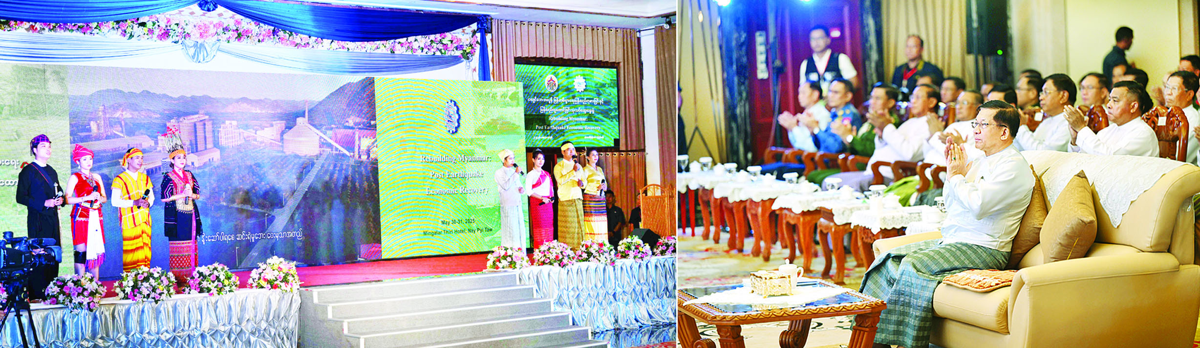 ငလျင်ဘေးအလွန် မြန်မာ့စီးပွားရေးပြန်လည်ကုစားခြင်းနှင့် ပြန်လည်ထူထောင်ခြင်း သုံးသပ်ဆွေးနွေးပွဲ (Rebuilding Myanmar : Post Earthquake Economic Recovery) ဖွင့်ပွဲအခမ်းအနားကို ယနေ့နံနက်ပိုင်းတွင် နေပြည်တော်ရှိ မင်္ဂလာသီရိဟိုတယ်၌ ကျင်းပပြုလုပ်ရာ နိုင်ငံတော်စီမံအုပ်ချုပ်ရေးကောင်စီဥက္ကဋ္ဌ နိုင်ငံတော်ဝန်ကြီးချုပ် ဗိုလ်ချုပ်မှူးကြီး မင်းအောင်လှိုင်တက်ရောက်၍ အဖွင့်အမှာစကားပြောကြားသည်။