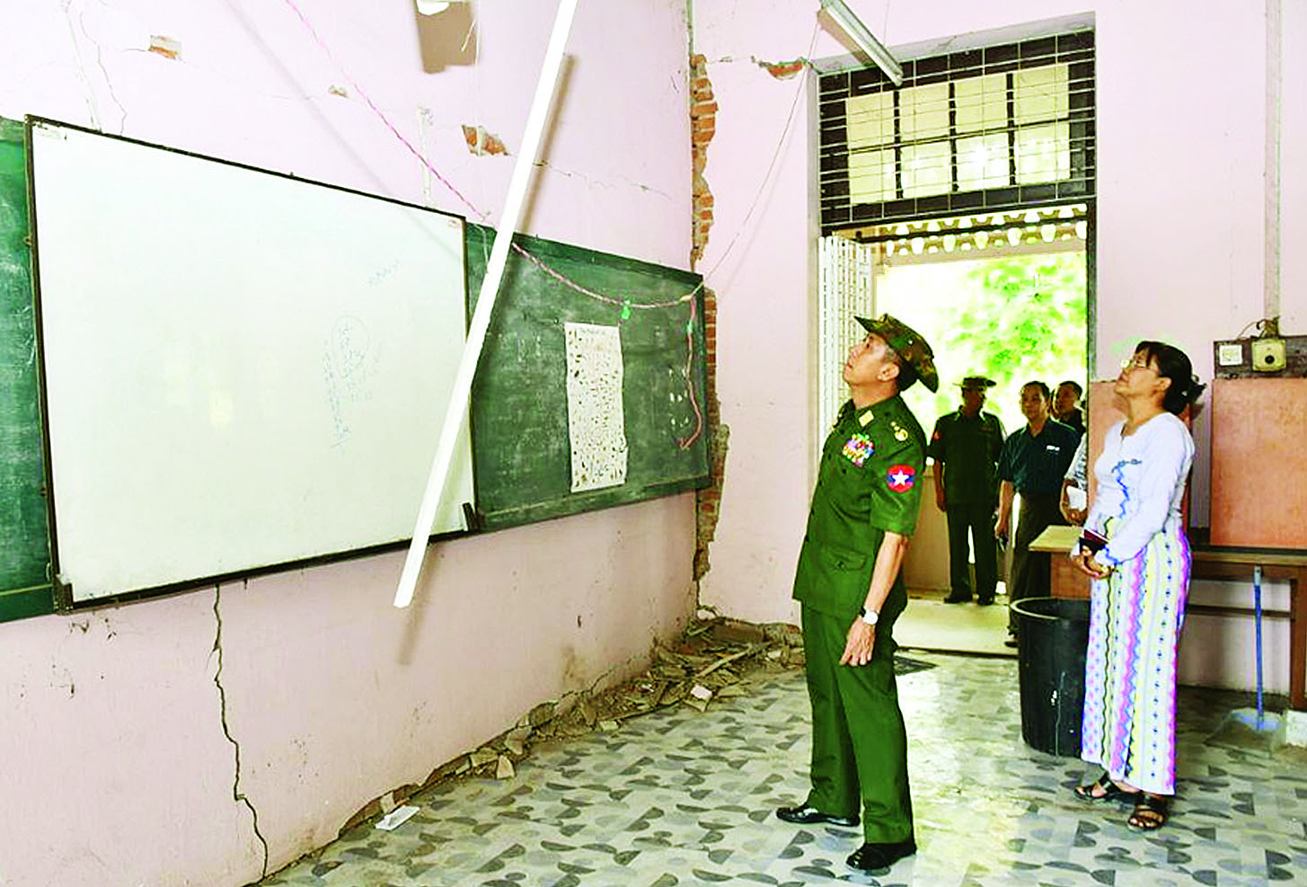 ထို့အတူ ကာကွယ်ရေးဦးစီးချုပ်ရုံး (ကြည်း) မှ ဒုတိယဗိုလ်ချုပ်ကြီး မျိုးသန့်နိုင်နှင့် တာဝန်ရှိသူများသည် ကျောက်ဆည်ခရိုင် စဉ့်ကိုင်မြို့နယ်ရှိ ကျောက်ဆည်တက္ကသိုလ်၌ ငလျင်ဒဏ်ကြောင့် ပျက်စီးသွားသော အပျက်အစီးများကို ပြန်လည်ပြုပြင်ဆောင်ရွက်နေမှုများနှင့် ပြင်ဆင်ထိန်းသိမ်း ခြင်းလုပ်ငန်း ဆောင်ရွက်နေမှုများ၊ ကွန်ပျူတာတက္ကသိုလ် (မန္တလေး) ၌ ငလျင်ဒဏ်ကြောင့် စာမေးပွဲ ဖြေဆိုရန် ရပ်တန့်ခဲ့ရသော ကျောင်းသား ကျောင်းသူများ စာမေးပွဲပြန်လည်ဖြေဆိုနေမှုများနှင့် ယာယီစာသင် ဆောင်များ ဆောက်လုပ်နေမှုများ၊ တရုတ်စုရပ်ကွက် မျက်စိအထူးကုဆေးရုံရှိ ငလျင်ဒဏ်ကြောင့် ထိခိုက်ပျက်စီးခဲ့သော အဆောက်အအုံများနှင့် ဆေးကုသမှုများ ဆောင်ရွက်ပေးနေမှုများကို သွားရောက် ကြည့်ရှုစစ်ဆေးပြီး လိုအပ်သည်များ ပေါင်းစပ်ညှိနှိုင်း ဆောင်ရွက်ပေးသည်။