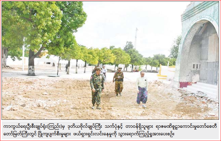 ထိုသို့ ဆောင်ရွက်ပေးလျက်ရှိရာ ယနေ့တွင် ကာကွယ်ရေးဦးစီးချုပ်ရုံး (ကြည်း)မှ ဒုတိယဗိုလ်ချုပ်ကြီး သက်ပုံ နှင့် တာဝန်ရှိသူများသည် စစ်ကိုင်းမြို့ သောတပန်ရပ်ကွက် သကျမီတာသီလရှင် စာသင်တိုက်ရှိ ငလျင်ဒဏ်ကြောင့် ပြိုကျပျက်စီးခဲ့သော သာသနိကအဆောက်အအုံများကို စက်ယန္တာရားကြီးများဖြင့် အရှိန်အဟုန်မြှင့် ဖယ်ရှားရှင်းလင်းပေးနေ မှုတို့ကိုလည်းကောင်း၊ ပိုးတန်းရပ်ကွက် ငလျင်ဒဏ်ကြောင့် ပြိုကျပျက်စီးခဲ့သော အမှတ်(၁) အခြေခံပညာအထက်တန်း ကျောင်းရှိ သုံးထပ်ဆောင်ကို ရှင်းလင်း နေမှုအခြေအနေများ၊ ရေသန့်စက်ထားရှိမည့် အဆောက်အအုံအသစ် ဆောက်လုပ် နေမှုအခြေအနေ များနှင့် စာသင်ကျောင်းအတွင်း သန့်ရှင်းသာယာလှပရေး ဆောင်ရွက်ပြီးစီးမှု အခြေအနေများကို လည်းကောင်း၊ မင်းလမ်းရပ်ကွက် ရတနာဗိမာန် ထူပါရုံရွှေကျောင်းတိုက်ရှိငလျင်ဒဏ်ကြောင့် ပြိုကျပျက်စီးခဲ့သော သာသနိကအဆောက်အအုံများကို စက် ယန္တာရားကြီးများဖြင့် အရှိန်အဟုန်မြှင့် ဖယ်ရှားရှင်းလင်းပေးနေမှုတို့ကို လည်း ကောင်း၊ စီတီးရပ်ကွက် ငလျင်ဒဏ် ကြောင့် ပြိုကျပျက်စီးခဲ့သော ရာဇမဏိစူဠာကောင်းမှုတော်စေတီတော်မြတ်ကြီး ၏ပရိဝုဏ်အတွင်း သာသနိကအဆောက် အအုံများ ဖယ်ရှားရှင်းလင်းပြီးစီးမှုအခြေ အအုံများ အနေများနှင့် စေတီတော်ကြီးပြန်လည် ပြုပြင်မွမ်းမံ တည်ဆောက်မည့် အခြေအနေများကိုလည်းကောင်း လိုက်လံကြည့်ရှုစစ်ဆေးပြီး လိုအပ်သည်များကို တာဝန်ရှိသူများနှင့် ပေါင်းစပ်ညှိနှိုင်းပေးသည်။