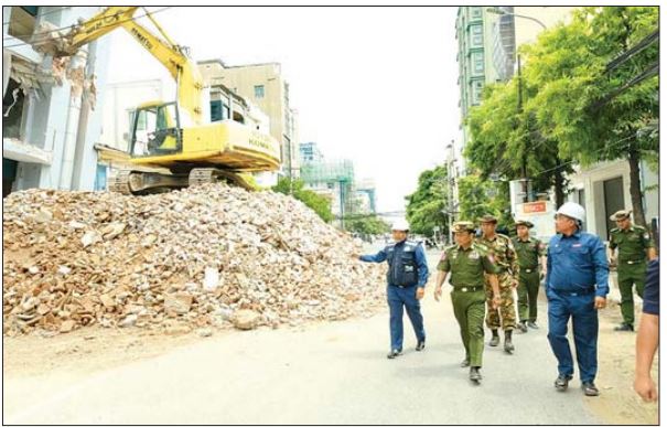အလားတူ ကာကွယ်ရေးဦးစီးချုပ်ရုံး(ကြည်း)မှ ဒုတိယဗိုလ်ချုပ်ကြီး စိုးတင့်နိုင်နှင့် တာဝန်ရှိသူများသည် မန္တလေးမြို့ အောင်မြေသာစံမြို့နယ် အနှိပ်တော်ရပ်ကွက်ရှိ Sky Villa နေရာတွင် ငလျင်ဒဏ်ကြောင့် ထိခိုက်ပျက်စီးခဲ့သော ရှင်းလင်းရန်ကျန်ရှိနေသည့် “ A” အဆောင်အား စက်ယန္တရားကြီးများ အသုံးပြု၍ ဖယ်ရှားရှင်းလင်းရေးလုပ်ငန်းများ ဆောင်ရွက်နေသည့် အခြေအနေနှင့် ဖယ်ရှားရှင်းလင်းရာမှ တွေ့ရှိသော ပစ္စည်းများကို ပစ္စည်းလက်ခံရေးနှင့် ပြန်လည်အပ်နှံရေးအဖွဲ့ထံသို့ စနစ်တကျ အပ်နှံမှု၊ ထိန်းသိမ်းထားရှိမှုအခြေအနေများအားလည်းကောင်း၊ သက်ဆိုင်ရာ ပိုင်ရှင်များလက်ဝယ်သို့ ပြန်လည် လွှဲပြောင်းပေးနိုင်မှုအခြေအနေများအားလည်းကောင်း ကြည့်ရှုစစ်ဆေး၍ တာဝန်ရှိသူများ၏ တင်ပြချက်များအပေါ်လိုအပ်သည်များ ပေါင်းစပ်ညှိနှိုင်း ဆောင်ရွက်ပေးသည်။