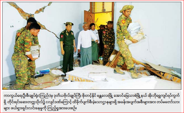 ထို့အတူ ကာကွယ်ရေးဦးစီးချုပ်ရုံး (ကြည်း) မှ ဒုတိယဗိုလ်ချုပ်ကြီး စိုးတင့် နိုင်နှင့် တာဝန်ရှိသူများသည် တာဝန်ရှိသူများနှင့်အတူ မန္တလေးမြို့ အောင်မြေ သာစံမြို့နယ် အိုးဘိုရွှေကျင်ရပ်ကွက်ရှိတိုင်းရင်းဆေး တက္ကသိုလ်သို့ သွားရောက်၍ တိုင်းရင်းဆေးတက္ကသိုလ်ပါမောက္ခ ချုပ်က ငလျင်ဒဏ်ကြောင့် ထိခိုက် ပျက်စီးခဲ့သော ပင်မဆောင်အား လိုက်လံ ရှင်းလင်းပြသပြီး ထိခိုက်ပျက်စီးခဲ့သော ဌာနများရှိ အခန်းများ အား တပ်မတော် သားစစ်သည်များက အင်တိုက်အားတိုက် ဖယ်ရှားရှင်းလင်းနေမှုကိုလည်းကောင်း၊ အမရဌာနီအရှေ့ရပ်ရှိ ဝေါင်းတော်ရ ဆုတောင်းပြည့်မြတ်စွာဘုရား၊ ရေနား ပရိယတ္တိစာသင်တိုက်တို့တွင် ငလျင်ဒဏ် သင့်ပြီး ထိခိုက်ပျက်စီးခဲ့သော နှစ်ထပ် ကျောင်းဆောင်အား ကြည့်ရှုစစ်ဆေး ပြီး အပျက်အစီးများကို အဖွဲ့အစည်း အသီးသီးမှု အင်တိုက်အားတိုက်ရှင်းလင်း ဖယ်ရှားနေမှုများကို လည်းကောင်း ကြည့်ရှုအားပေးပြီး ကျောင်းထိုင်ဆရာ တော်ကြီးအား အလှူငွေများ ဆက်ကပ် လှူဒါန်း၍ လိုအပ်သည်များ ပေါင်းစပ် ညှိနှိုင်းဆောင်ရွက်ပေးသည်။
