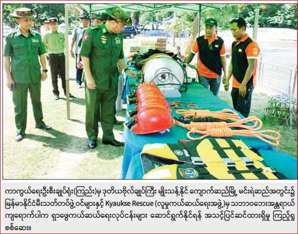 အလားတူ ကာကွယ်ရေးဦးစီးချုပ်ရုံး(ကြည်း)မှ ဒုတိယဗိုလ်ချုပ်ကြီး မျိုးသန့်နိုင်နှင့် တာဝန်ရှိသူများ သည် ကျောက်ဆည်မြို့ မင်းရဲဆည်အတွင်း၌ မြန်မာနိုင်ငံမီးသတ် တပ်ဖွဲ့ဝင်များနှင့် Kyaukse Rescue (လူမှုကယ်ဆယ်ရေးအဖွဲ့)မှ သဘာဝဘေး အန္တရာယ်ကျရောက်ပါက ရှာဖွေကယ်ဆယ်ရေး လုပ်ငန်းများ ဆောင်ရွက်နိုင်ရန်အတွက် Speed Boat မောင်းနှင်လေ့ကျင့်မှုနှင့် ရေပြင်အသက် ကယ်ဆယ်ရေး လုပ်ငန်းများ လေ့ကျင့်ဆောင်ရွက်နေ မှုများကို သွားရောက်ကြည့်ရှုစစ်ဆေးပြီး သဘာဝ ဘေးအန္တရာယ် များအတွက် မြေပြင်၌ အမှန်တကယ် လက်တွေ့အသုံးချနိုင်ရေးအတွက် ရည်ရွယ်ဆောင်ရွက်ခြင်း ဖြစ်ကြောင်း မှာကြားခဲ့ကာ လေ့ကျင့် ဆောင်ရွက်နေသူများအား စားသောက်ဖွယ်ရာများ ပေးအပ်ခဲ့ပြီး တာဝန်ရှိသူများက တင်ပြချက်များအပေါ် လိုအပ်သည်များ ပေါင်းစပ်ညှိနှိုင်းဆောင်ရွက်ပေးသည်။