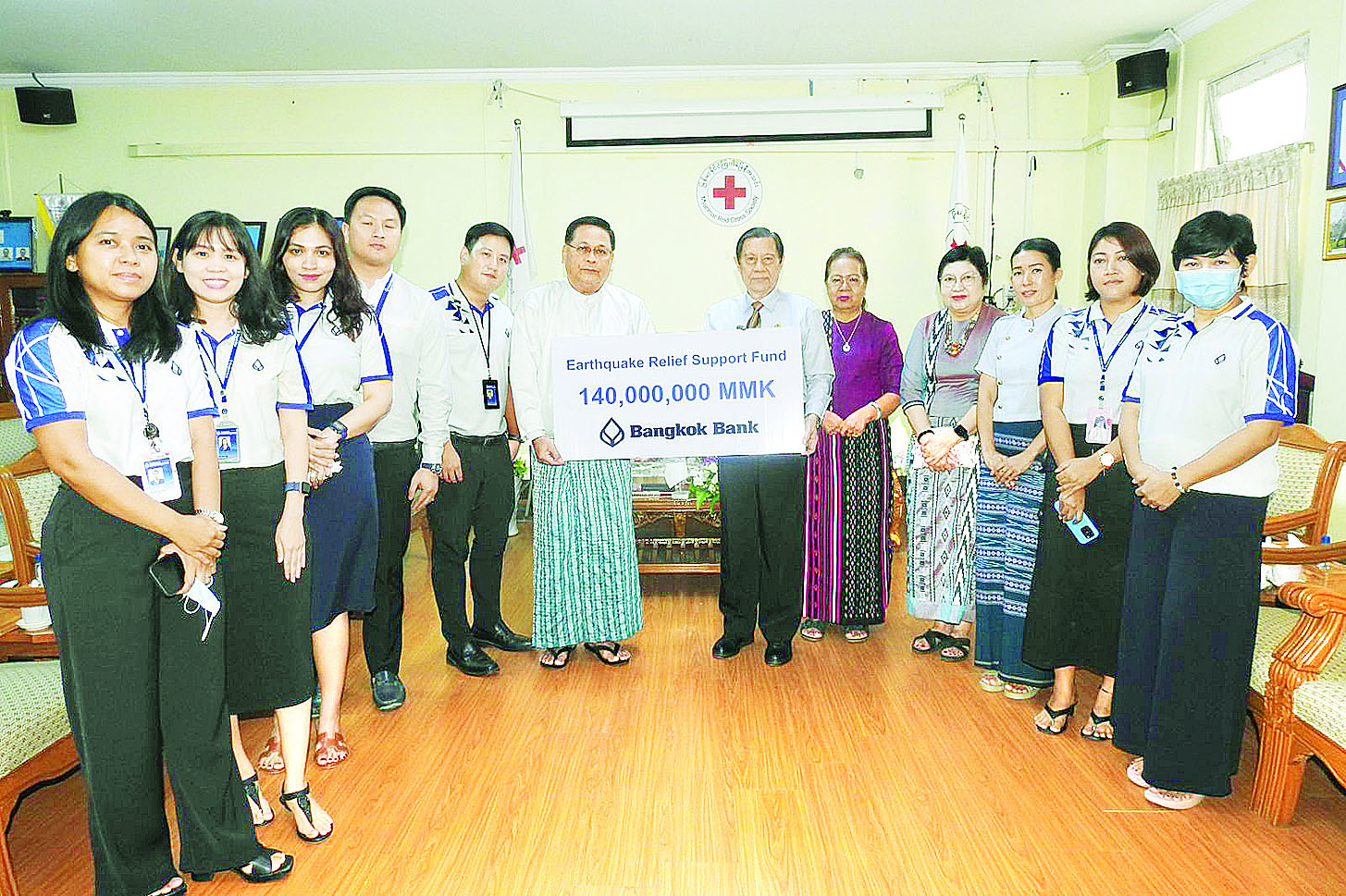 မြန်မာနိုင်ငံကြက်ခြေနီအသင်းမှ ဆောင်ရွက်လျက်ရှိသော ငလျင်တုံ့ပြန်ဆောင်ရွက်ရေးလုပ်ငန်းများတွင် အသုံးပြုရန်အတွက် BANGKOK BANK PCL (Yangon Branch) မှ အလှူငွေကျပ် ၁၄၀၀၀၀၀၀၀ ကို မေ ၃၀ ရက်က မြန်မာနိုင်ငံကြက်ခြေနီအသင်း ရန်ကုန်ရုံးခွဲ၌ လာရောက်လှူဒါန်းသည်။