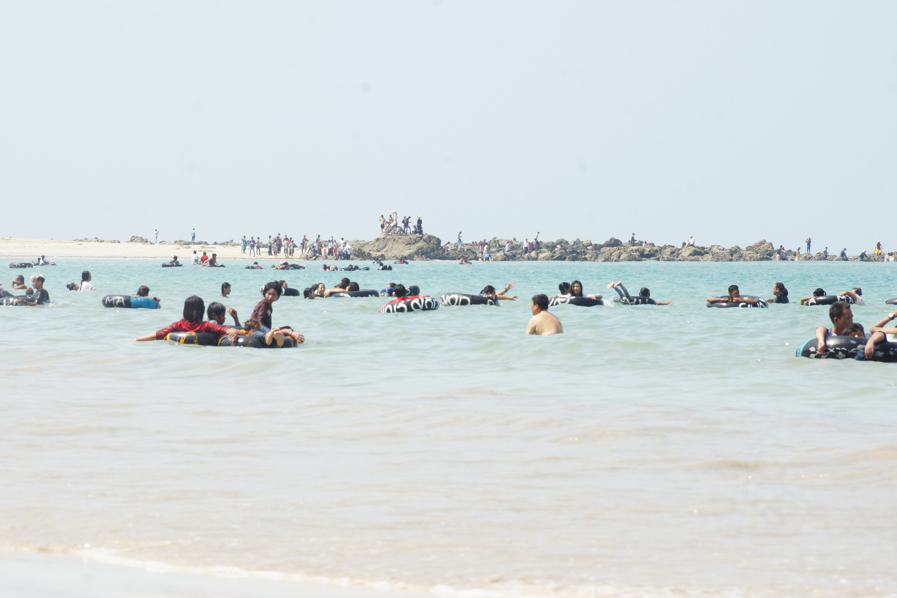 ငပလီကမ်းခြေတွင် သင်္ကြန်အကြတ်နေ့၌ အနယ်နယ်အရပ်ရပ်မှ ခရီးသွားပြည်သူများ၊ ကမ္ဘာလှည့်ခရီးသွား ဧည့်သည်များ၊ ဒေသခံပြည်သူများဖြင့် စည်ကားလျက်ရှိနေ