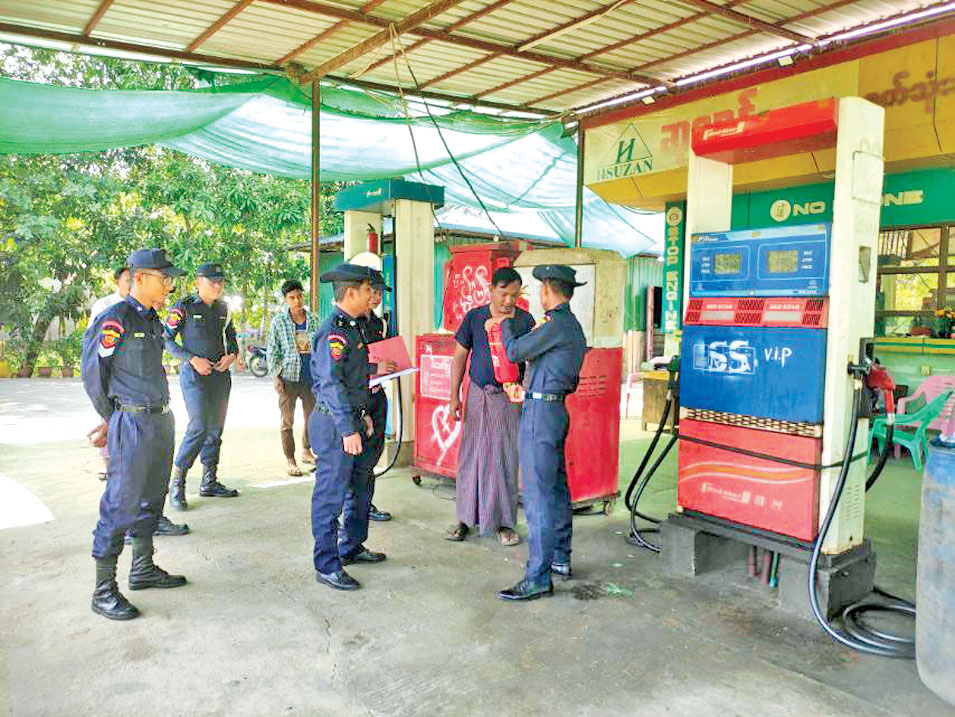 ဧရာဝတီတိုင်းဒေသကြီး ငပုတောမြို့နယ်အတွင်းရှိ စက်သုံးဆီ အရောင်းဆိုင်များအား မီးဘေးလုံခြုံရေးစစ်ဆေးခြင်းကို ဆောင်ရွက်လျက်ရှိရာ ယနေ့နံနက်ပိုင်းက ဆုဈာန်စက်သုံးဆီ အရောင်းဆိုင်အား မီးဘေးအန္တရာယ်ကြိုတင်ကာကွယ်နိုင်ရေး တာဝန်ရှိသူများက ကြည့်ရှုစစ်ဆေးသည်။