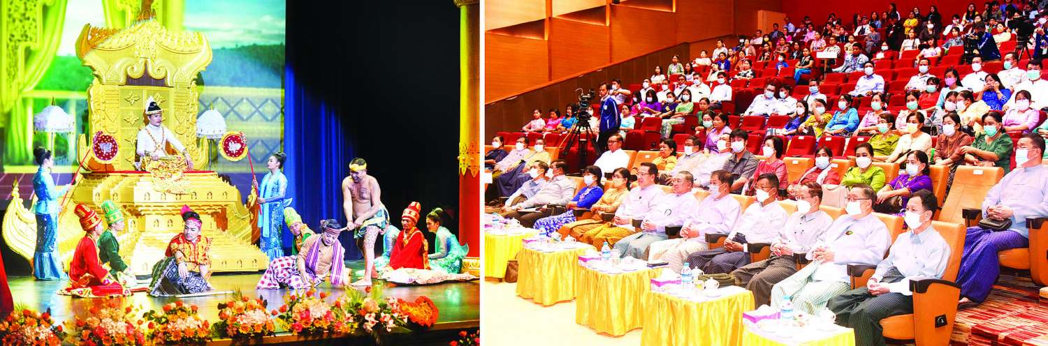 ယင်းနောက် ပြည်ထောင်စုဝန်ကြီးနှင့်အဖွဲ့သည် မြန်မာ့အသံနှင့် ရုပ်မြင်သံကြားတွင် ရိုက်ကူးထုတ်လွှင့်မည့် “နိပါတ်တော်လာ ဇာတ်သဘင်မဟာ” အစီအစဉ်မှ “တံခါးမှူး ဒတ္ထ ဇာတ်တော်” ကပြဖျော်ဖြေတင်ဆက်မှုကို ကြည့်ရှုအားပေးကြသည်။