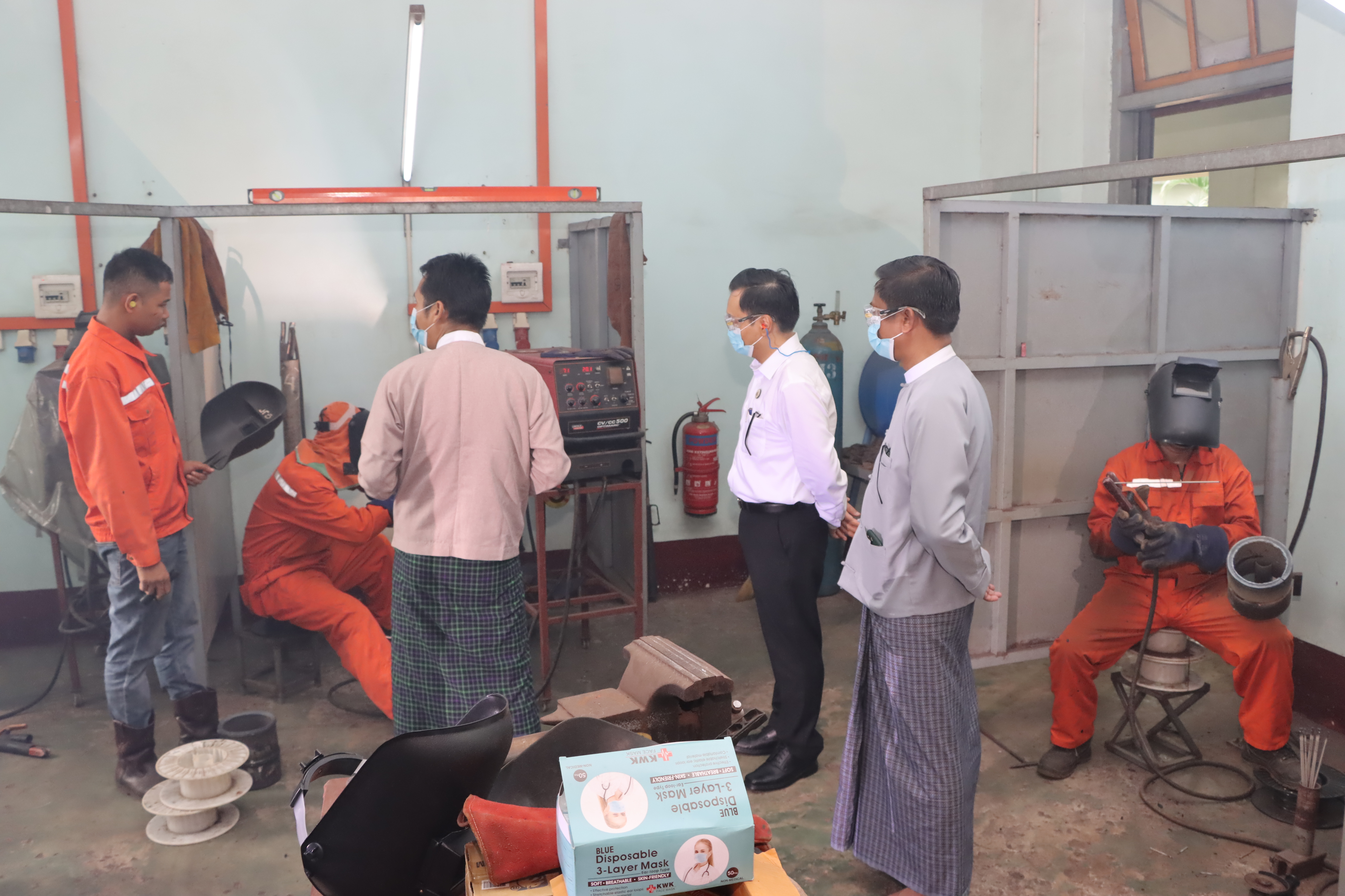 ကြည့်ရှုစစ်ဆေးစဉ် သင်တန်းကျောင်းတာဝန်ခံက ကျောင်းဆိုင်ရာအချက်အလက်များကို ရှင်းလင်း တင်ပြပြီး ကွန်ပျူတာအခြေပြု Welding Simulator များ အသုံးပြု၍ လေ့ကျင့်သင်ကြား ပေးနေမှုများ၊ အလုပ်ရုံများတွင် Arc Welding Training Course ၊ Gas Metal Arc Welding Training Course နှင့် Pipe Welding Training Course များကို လေ့ကျင့်သင်ကြားပေးနေမှုများနှင့် အခြားလက်တွေ့ သင်ကြားပေးနေမှုများကို ရှင်းလင်းတင်ပြသည်။