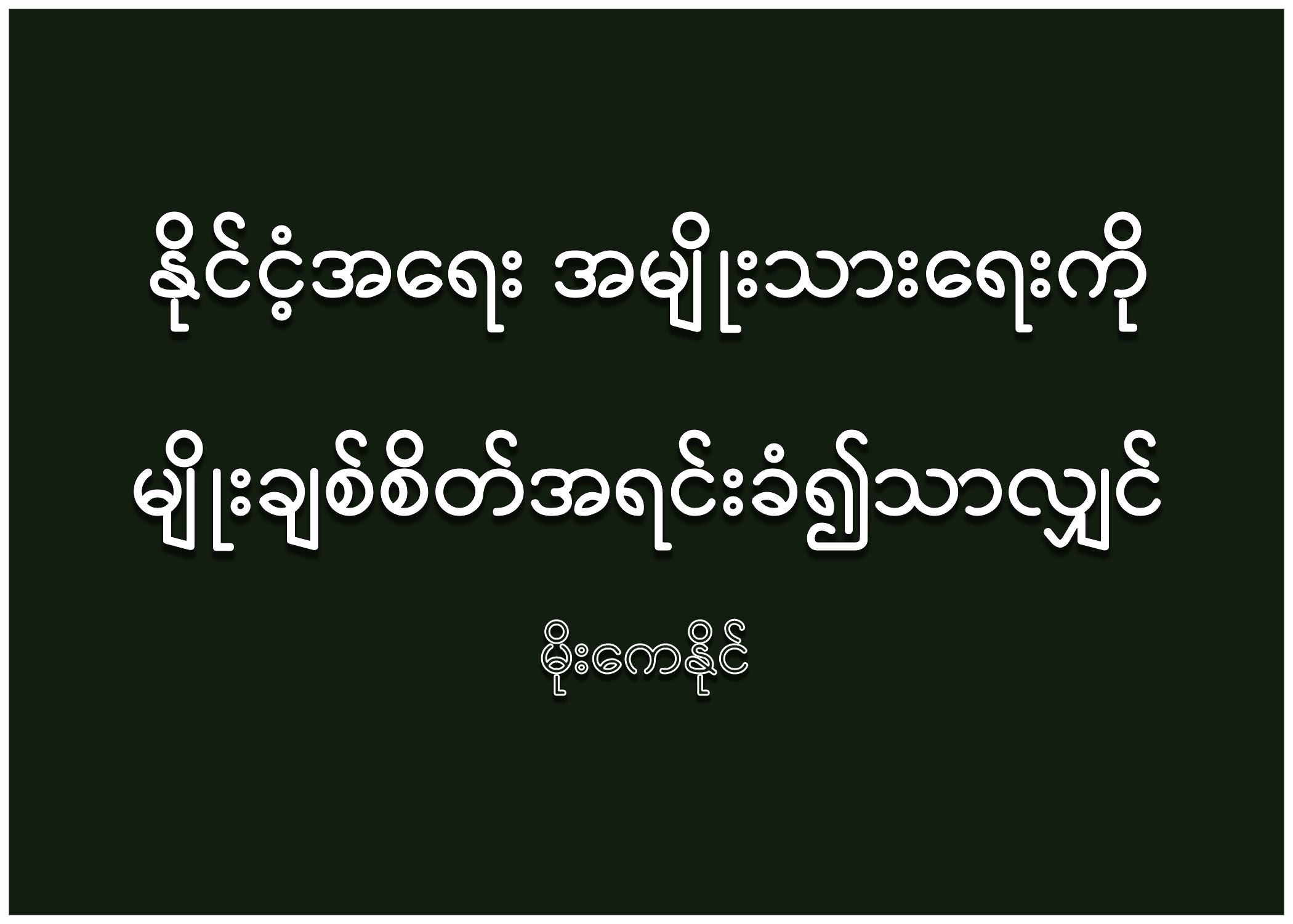 မကြာသေးမီက ပြီးစီးခဲ့သည့် အမေရိကန်ရွေးကောက်ပွဲ၌ အမျိုးသားရေးအားသန် ဒေါ်နယ်ထရမ့်တစ်ယောက် ဘာကြောင့် အနိုင်ရခဲ့ပါသလဲ၊ အမေရိကန်နိုင်ငံကြီးက အမေရိကန်လူမျိုးတို့၏ အကျိုးစီးပွားသာအဓိကဟူသော ကြွေးကြော်သံကို အမေရိကန်လူထုကြီးက နှစ်သက်ကြ၍သာ သမ္မတဟောင်းကြီးကို ပုံအောမဲထည့်ခဲ့ကြခြင်း ဖြစ်သည်။ မျိုးချစ်စိတ်ကို အခြေခံထားသည့် Make America Great Again က အလုပ်ဖြစ်ခဲ့ပုံရသည်။ လတ်တလော ဥပမာဆိုပေမယ့် ကမ္ဘာကြီးမှာ Liberal democracy မှ Nationalism အခြေခံ democracy သို့ဆီ ရွေ့လျားလာသည့်အခြေအနေများကို သတိမပြု ဘဲမနေသင့်ပါ။ လက်ရှိ ရုရှား၊ တရုတ်၊ အိန္ဒိယ စသည့်နိုင်ငံ့ခေါင်းဆောင်များအားလုံး နိုင်ငံတိုးတက်အောင် ဦးဆောင်မှုပေးနိုင်သော အမျိုးသားရေး ခေါင်းဆောင်များဖြစ်ကြသည်။ သူတို့တွေသည် ခေတ်စနစ်တွေ ဘယ်လိုပြောင်းပြောင်း မျိုးချစ်စိတ်နှင့် အမျိုးသားရေးတာဝန်ကိုတော့ ဘယ်တော့မှလျစ်လျူရှုခဲ့ဟန်မတူ။ ယူသင့်တာယူ၊ အတုယူသင့်တာ ယူရမည်ဖြစ်သည်။ အနာဂတ်တွင် အားလုံးက မျိုးချစ်စိတ်အခြေခံသည့် အမျိုးသားအကျိုးစီးပွား အမျိုးသားရေးတည်ဆောက်မှုများဘက်သို့သာ ရွေ့လျားလာတော့မည်လား ခန့်မှန်းနိုင်ပါသည်။
