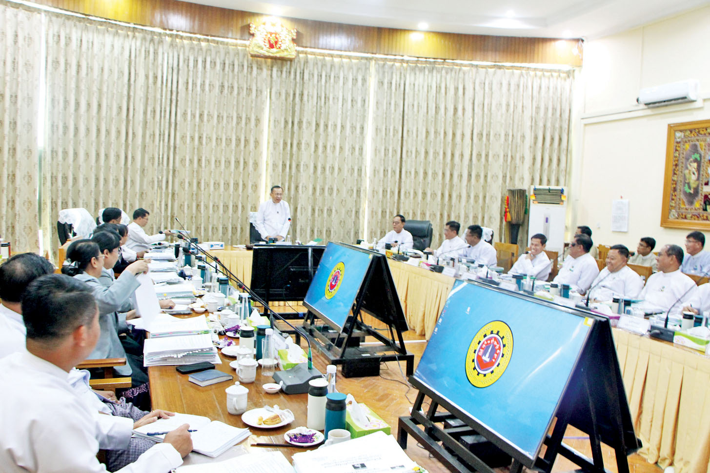 ထို့နောက် ပြည်ထောင်စုဝန်ကြီး ဦးမင်းနောင်က နွေစပါး၊ မိုးစပါး စီမံကိန်း၊ ဆောင်းဆီထွက်သီးနှံ (မြေပဲ၊ နှမ်း၊ နေကြာ)စီမံကိန်း၊ မွေးမြူရေးစီမံကိန်း၊ စိုက်ပျိုးရေ ရရှိရေးစီမံကိန်းများ အကောင်အထည်ဖော် ဆောင်ရွက်မှုအခြေအနေကို လည်းကောင်း၊ ပြည်ထောင်စုဝန်ကြီး ဦးလှမိုးက စိုက်ပျိုးရေး၊ မွေးမြူရေးနှင့် ဆည်မြောင်းဝန်ကြီးဌာနနှင့် သမဝါယမနှင့် ကျေးလက်ဖွံ့ဖြိုးရေး ဝန်ကြီးဌာနတို့ ပူးပေါင်း၍ မိုးစပါးစီမံကိန်း အကောင်အထည်ဖော် ဆောင်ရွက်မှုအခြေအနေကို လည်းကောင်း၊ ပြည်ထောင်စုဝန်ကြီး ဒေါက်တာ ချာလီသန်းက တိုင်းဒေသကြီး၊ ပြည်နယ်များသို့ MSME ဖွံ့ဖြိုးရေးချေးငွေ ထုတ်ချေးထားမှု အခြေအနေကို လည်းကောင်း၊ ပြည်ထောင်စုဝန်ကြီး ဦးချစ်ဆွေက သက်ဆိုင်ရာဝန်ကြီးဌာနများက နိုင်ငံတော်အတွက် ဝင်ငွေရှာဖွေပေးနိုင်မှု အခြေအနေ နှင့် လုပ်ငန်းလိုင်စင်ချပေးမှု အခြေအနေကို လည်းကောင်း၊ ဒုတိယဝန်ကြီး ဒေါ်သန်းသန်းလင်းက နိုင်ငံ့စီးပွားမြှင့်တင်ရေးရန်ပုံငွေဖြင့် ဆီစက်လုပ်ငန်းများ ဖွံ့ဖြိုးရေးချေးငွေထုတ်ချေးပေးမှု အခြေအနေ နှင့် မြန်မာ့လယ်ယာဖွံ့ဖြိုးရေးဘဏ်၏ ကြွေးကျန်ကောက်ခံရရှိမှု အခြေအနေများကို လည်းကောင်း ဆွေးနွေးပြောကြားကြသည်။