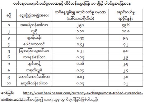 ဇာစ်မြစ်။ https://www.bankbazaar.com/currency-exchange/most-traded- currencies-in-the-world ပေါ်အခြေခံ၍ စာရေးသူမှ တွက်ချက်ခြင်းဖြစ်ပါသည်။