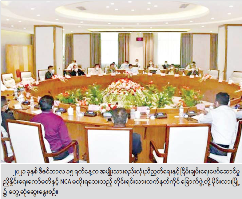 ယခုလက်ရှိအခြေအနေမှာ ကျီးလန့်စာစားဘဝနဲ့ ပြည်သူတွေရဲ့စိုးရိမ်ရေမှတ်က မြင့်တက်နေဆဲပါ။ သူတို့ရဲ့စိုးရိမ်သောကကို အပြန်အလှန်ယုံကြည်မှုက ပြေပျောက်စေနိုင်မလား၊ ဆင်းရဲဒုက္ခမျိုးစုံနဲ့ ဖိအားတွေအောက်ရောက်နေတဲ့ တိုင်းရင်းသားတွေရဲ့ဘဝကို ကယ်တင်ပေးနိုင်မလား ကြည့်ရပါမယ်။ အဓိကကယ်တင်ရှင်က လက်နက်ကိုင်တိုင်းရင်းသား ခေါင်းဆောင်တွေ ဖြစ်နေလို့ပါပဲ။ သူတို့လက်ထဲမှာပဲ ရှိပါတယ်။ ငြိမ်းချမ်းရေးတံခါးကို တပ်မတော်ဘက် က ဖွင့်ပေးပြီးသားပါ။ ထာဝရငြိမ်းချမ်းရေးအတွက် အာမခံချက်တစ်ခုဖြစ်တဲ့ စစ်မှန်စည်းကမ်းပြည့်ဝတဲ့ ပါတီစုံဒီမိုကရေစီနဲ့ ဖက်ဒရယ်ဒီမိုကရေစီကို အခြေခံတဲ့ ပြည်ထောင်စုကြီးတည်ဆောက်ဖို့ NCA ပါ ပေးထားချက်တွေအတိုင်း အခိုင်အမာ ဆက်လျှောက်ဖို့ သန္နိဋ္ဌာန်ချပြီးဖြစ်ပါတယ်။ NCA ဟာ စတင်ဆွေးနွေးစဉ်က ပါဝင်ခဲ့တဲ့ တိုင်းရင်းသား အဖွဲ့တွေရဲ့ တောင်းဆိုချက်တွေနဲ့အညီ ပဏာမ အများသဘောတူညီမှုရယူထားတဲ့ ယန္တရားတစ်ခု ဖြစ်တဲ့အတွက် နောက်ပြန်လှည့်ဖို့ အခြေအနေပေးမှာ မဟုတ်ပါဘူး။ ဖြစ်သင့်တာကို ဦးစားပေးရမယ့် အချိန် ရောက်နေတဲ့အတွက် သင်ခန်းစာယူသင့်တာယူပြီး အပြောထက် အလုပ်နဲ့သက်သေပြဖို့ပဲ ရှိပါတော့တယ်။