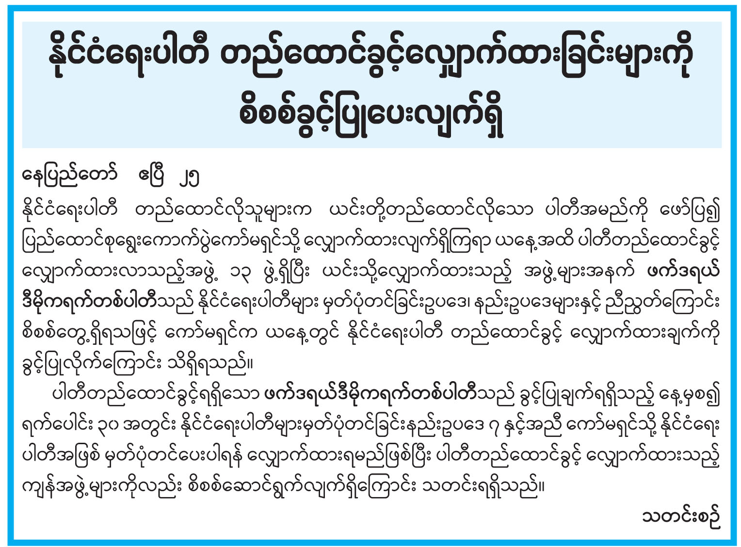 နိုင်ငံရေးပါတီ တည်ထောင်ခွင့်လျှောက်ထားခြင်းများကို စိစစ်ခွင့်ပြုပေးလျက်ရှိ