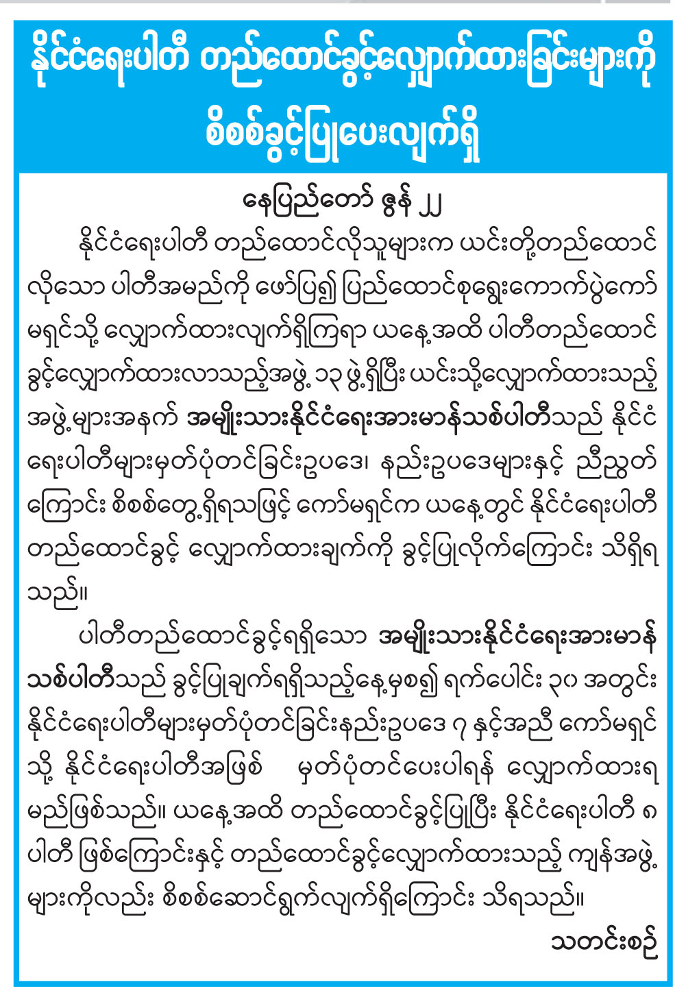 နိုင်ငံရေးပါတီ တည်ထောင်ခွင့်လျှောက်ထားခြင်းများကို စိစစ်ခွင့်ပြုပေးလျက်ရှိ