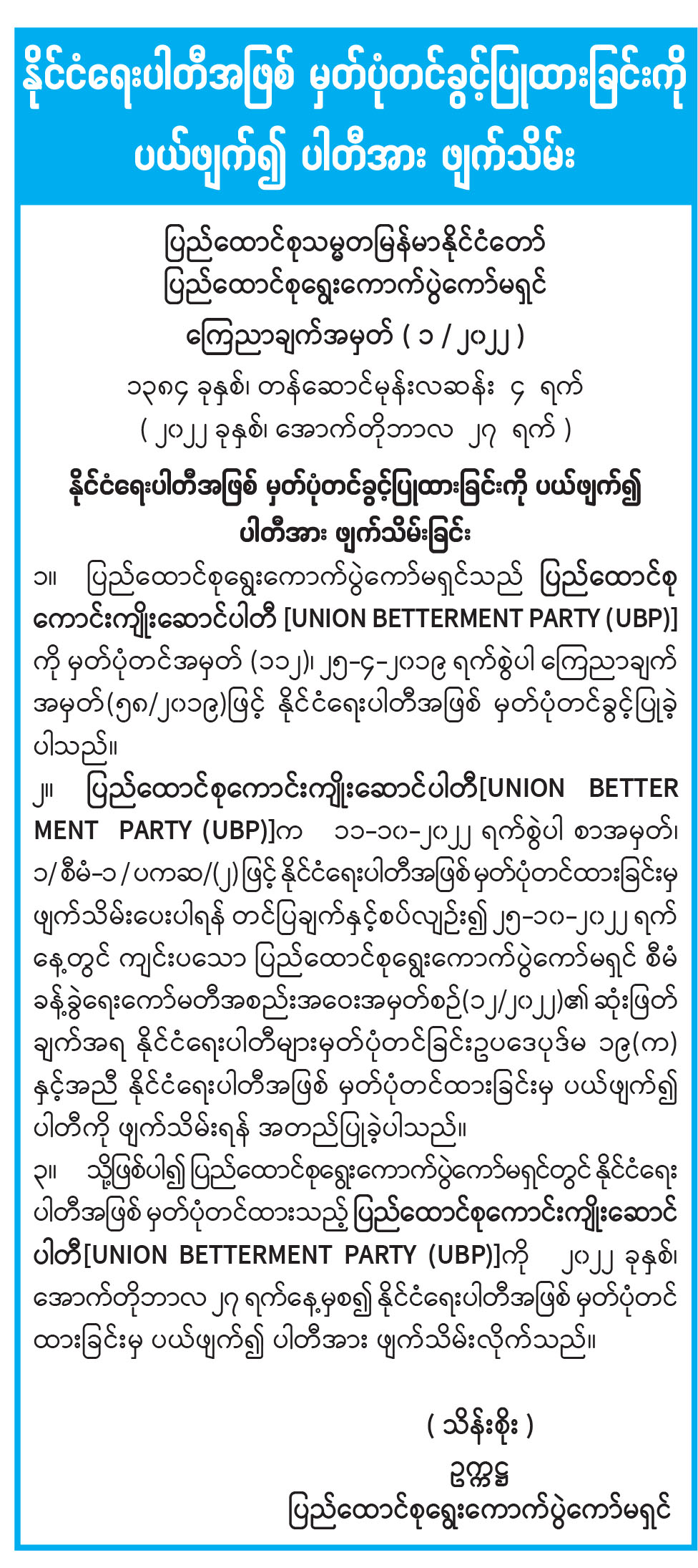 နိုင်ငံရေးပါတီအဖြစ် မှတ်ပုံတင်ခွင့်ပြုထားခြင်းကို ပယ်ဖျက်၍ ပါတီအား ဖျက်သိမ်း