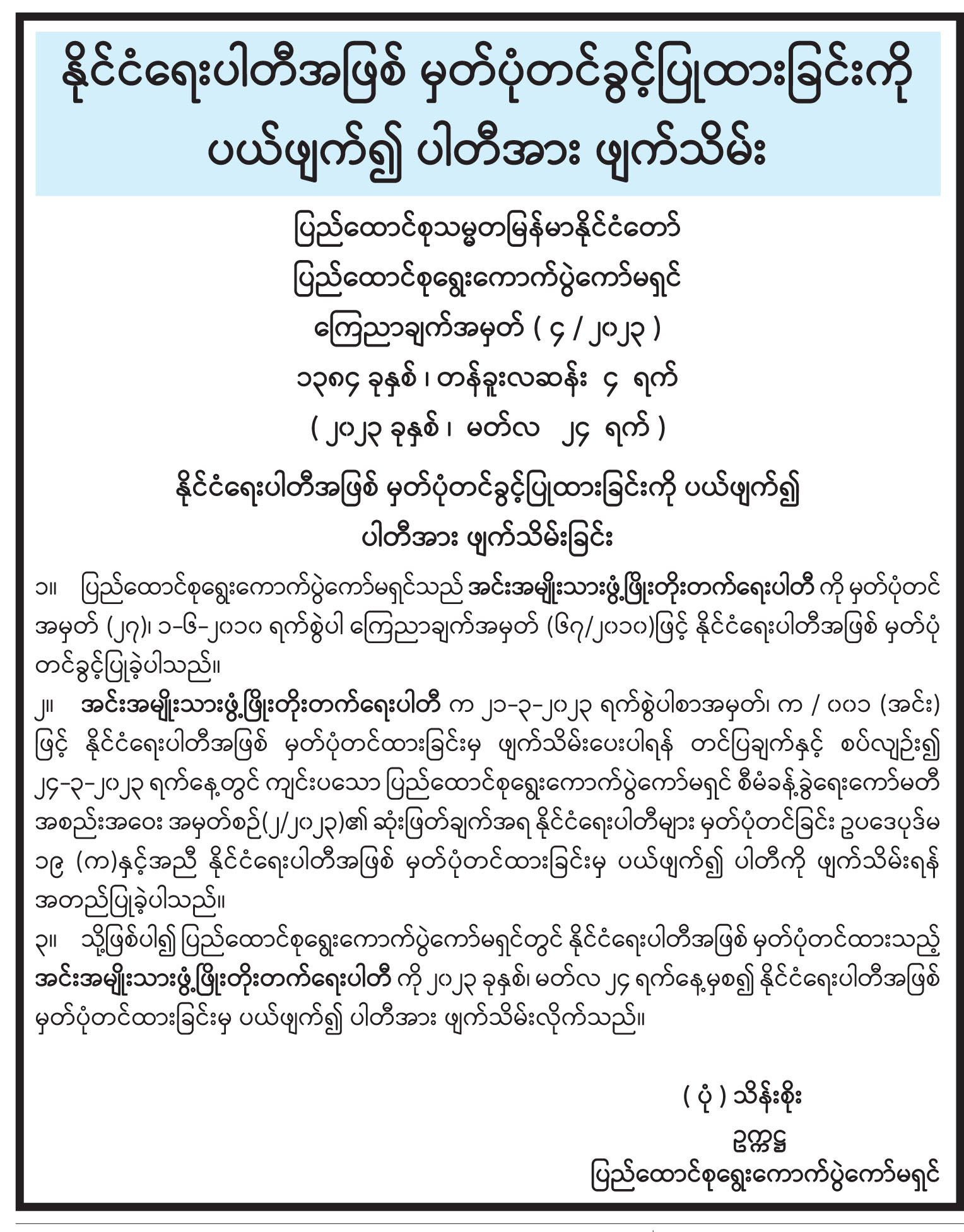 နိုင်ငံရေးပါတီအဖြစ် မှတ်ပုံတင်ခွင့်ပြုထားခြင်းကို ပယ်ဖျက်၍ ပါတီအား ဖျက်သိမ်း