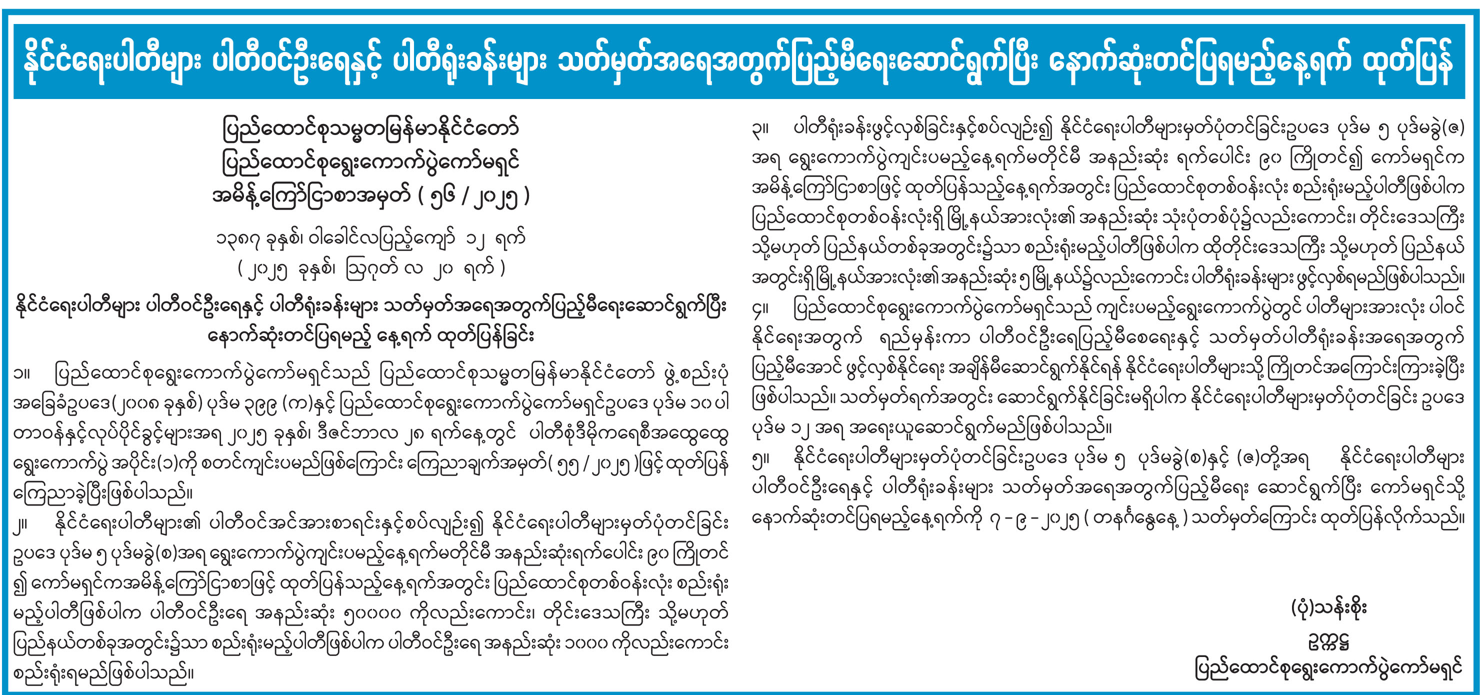 နိုင်ငံရေးပါတီများ ပါတီဝင်ဦးရေနှင့် ပါတီရုံးခန်းများ သတ်မှတ်အရေအတွက်ပြည့်မီရေးဆောင်ရွက်ပြီး နောက်ဆုံးတင်ပြရမည့်နေ့ရက် ထုတ်ပြန်