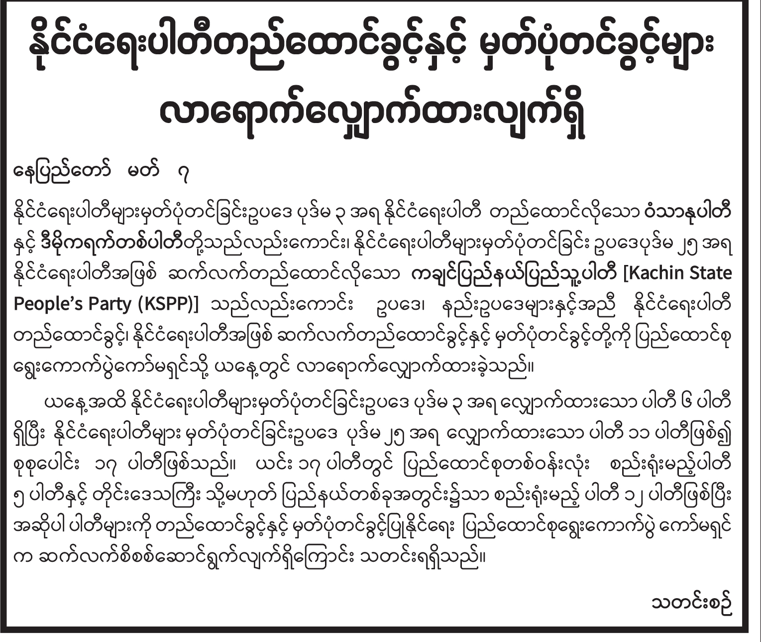 နိုင်ငံရေးပါတီတည်ထောင်ခွင့်နှင့် မှတ်ပုံတင်ခွင့်များ လာရောက်လျှောက်ထားလျက်ရှိ