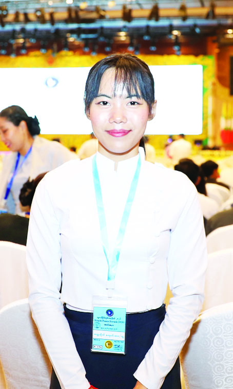 ရန်ကုန်မှာ ကျင်းပခဲ့တဲ့ လူငယ်နဲ့ ငြိမ်းချမ်းဖိုရမ်မှာလည်း တက်ရောက်ခွင့်ရခဲ့ပြီးတော့ အခုက ဒုတိယအကြိမ် ထပ်မံပါဝင်တက်ရောက်ခွင့်ရတာဖြစ်ပါတယ်။ ဒီလိုတက်ရောက်ခွင့်ရတဲ့အတွက် အင်မတန်ပျော်ရွှင်မိပါတယ်၊၊ နိုင်ငံတော်ဖွံ့ဖြိုးတိုးတက်ရေးနဲ့ ငြိမ်းချမ်းရေးအခန်းကဏ္ဍတွေမှာ လူငယ်တွေက အရေးကြီးတဲ့အခန်းကဏ္ဍမှာ ရှိနေတယ်ဆိုတာကို နိုင်ငံတော်အကြီးအကဲတွေက ဒီလိုဖိုရမ်ကနေ လူငယ်တွေကို သိရှိစေတယ်လို့ မြင်ပါတယ်။ လူငယ်တွေအနေနဲ့လည်း နိုင်ငံတော်တိုးတက်ရေးအတွက် ပါဝင်ဆောင်ရွက်ပေးကြဖို့ ဆန္ဒရှိကြတယ်လို့ထင်ပါတယ်။ ပြီးတော့ နိုင်ငံတော်အဆင့် ကျင်းပတဲ့ပွဲတွေမှာ လူငယ်တွေအနေနဲ့ လူကြီးတွေရဲ့ လုပ်ဆောင်မှုတွေကို တွေ့မြင်ရတယ်၊ အတုယူရပါတယ်။ နိုင်ငံအတွက် တကယ်အလုပ်လုပ်ကြတဲ့အခါ လူကြီးတွေရဲ့ လမ်းပြမှုနဲ့ အတွေ့အကြုံတွေလည်းလိုပါတယ်။ ဒီလိုလမ်းပြမှုတွေနဲ့အတူ လူငယ်တွေရဲ့ အင်အားနဲ့ ရှေ့ဆက်ကြမယ်ဆိုရင် ကျွန်မတို့နိုင်ငံတိုးတက်မယ်ဆိုတာ အသေအချာပါပဲ။