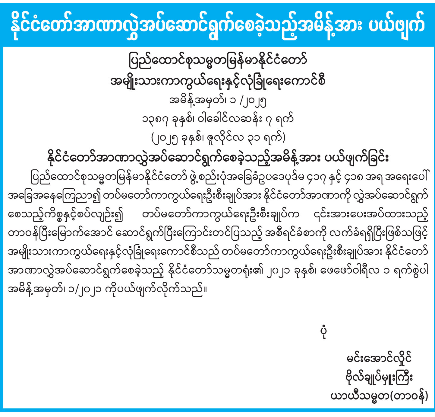 ပြည်ထောင်စုသမ္မတမြန်မာနိုင်ငံတော် ယာယီသမ္မတ နိုင်ငံတော်လုံခြုံရေးနှင့် အေးချမ်းသာယာရေး ကော်မရှင်ဥက္ကဋ္ဌ ဗိုလ်ချုပ်မှူးကြီး သတိုးမဟာသရေစည်သူ သတိုးသီရိသုဓမ္မ မင်းအောင်လှိုင်ထံမှ (၇၄) နှစ်မြောက် ကယားပြည်နယ်နေ့အခမ်းအနားသို့ပေးပို့သည့် သဝဏ်လွှာ