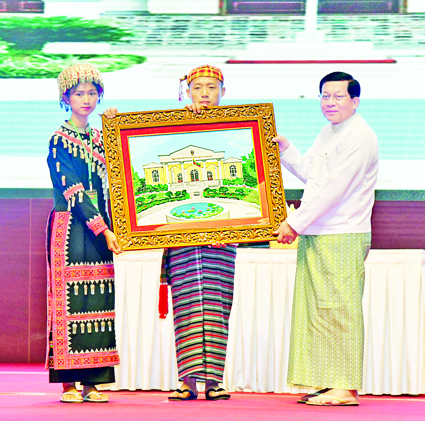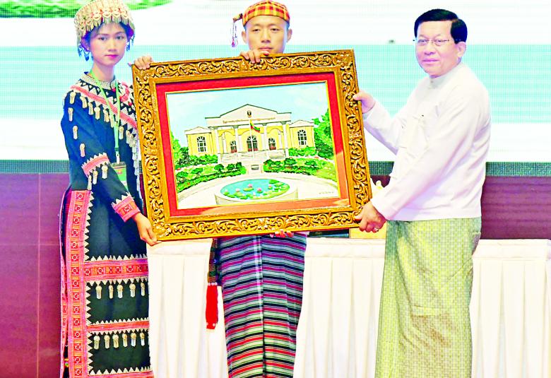 ယင်းနောက် နိုင်ငံတော်ယာယီသမ္မတ နိုင်ငံတော်လုံခြုံရေးနှင့် အေးချမ်းသာယာရေးကော်မရှင် ဥက္ကဋ္ဌထံ ကျောင်းသား ကျောင်းသူနှစ်ဦးက အမှတ်တရလက်ဆောင်ပစ္စည်းကို ဂါရဝပြုပေးအပ်သည်။