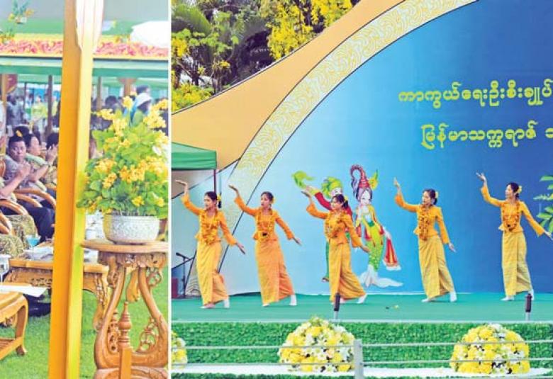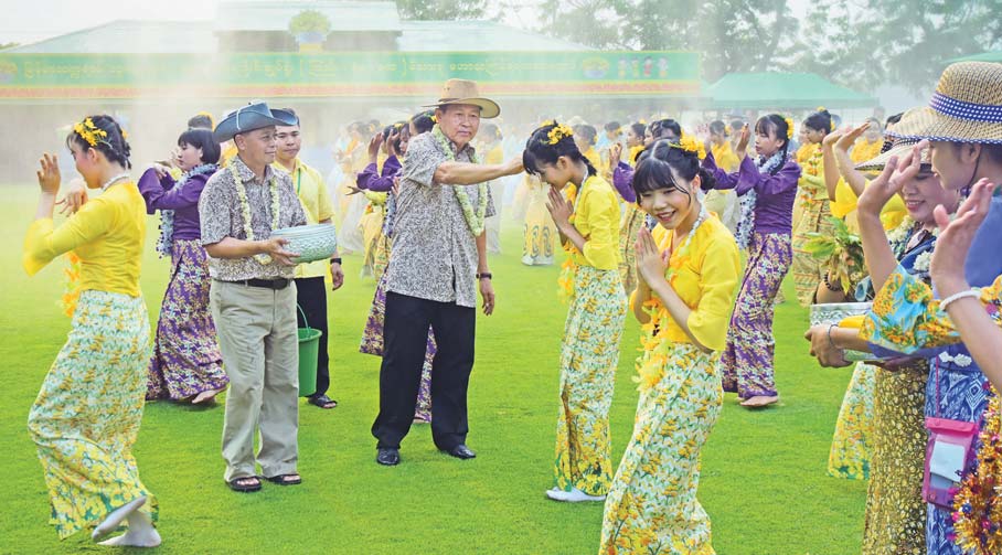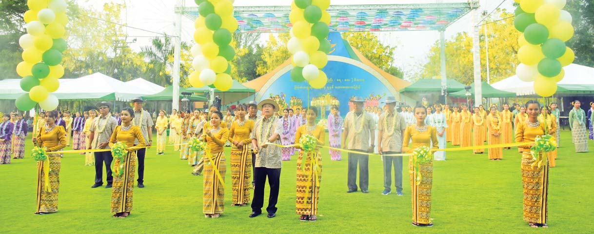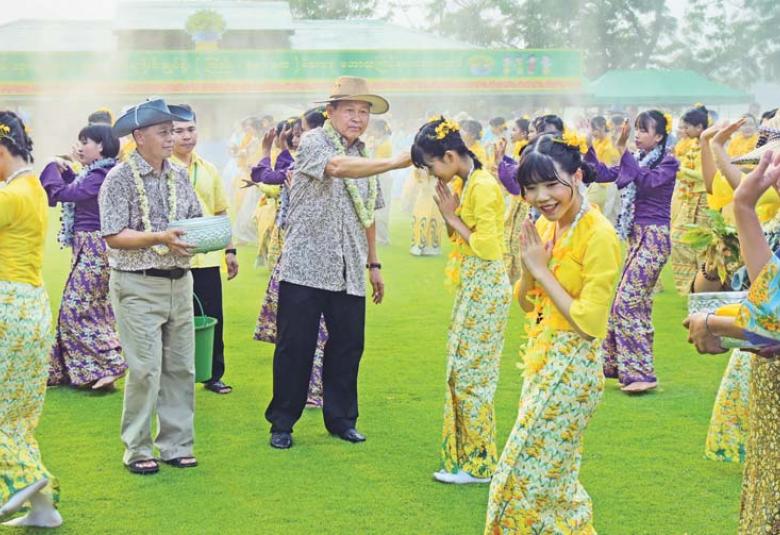၎င်းနောက် ယိမ်းအဖွဲ့သမီးပျိုများက “ ရက်မြတ်သင်္ကြန်” သီချင်းဖြင့် ကပြဖျော်ဖြေကြရာ ဖွင့်ပွဲအခမ်းအနား တက်ရောက်လာကြသူများက ယိမ်းအဖွဲ့များနှင့် ဧည့်ပရိတ်သတ်များအား အောင်သပြေခက်ဖြင့် အတာရေပက်ဖျန်းပေးကြသည်။
