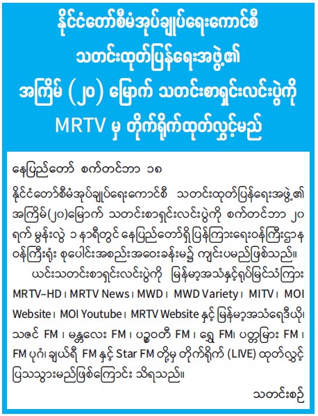 နိုင်ငံတော်စီမံအုပ်ချုပ်ရေးကောင်စီ သတင်းထုတ်ပြန်ရေးအဖွဲ့၏ အကြိမ် (၂၀) မြောက် သတင်းစာရှင်းလင်းပွဲကို MRTV မှ တိုက်ရိုက်ထုတ်လွှင့်မည်