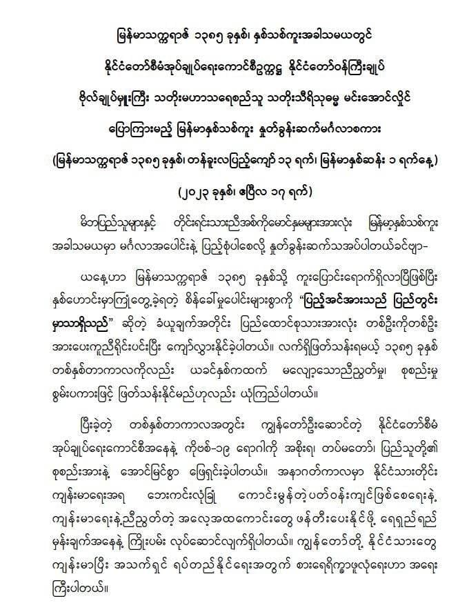 နိုင်ငံတော်စီမံအုပ်ချုပ်ရေးကောင်စီ ဥက္ကဋ္ဌ၊ နိုင်ငံတော်ဝန်ကြီးချုပ်၊ ဗိုလ်ချုပ်မှူးကြီး သတိုးမဟာသရေစည်သူ၊ သတိုးသီရိသုဓမ္မ မင်းအောင်လှိုင်၏ မြန်မာသက္ကရာဇ် ၁၃၈၅ ခုနှစ်၊ နှစ်ဆန်းတစ်ရက်နေ့ နှစ်သစ်ကူး နှုတ်ခွန်းဆက်မင်္ဂလာစကား