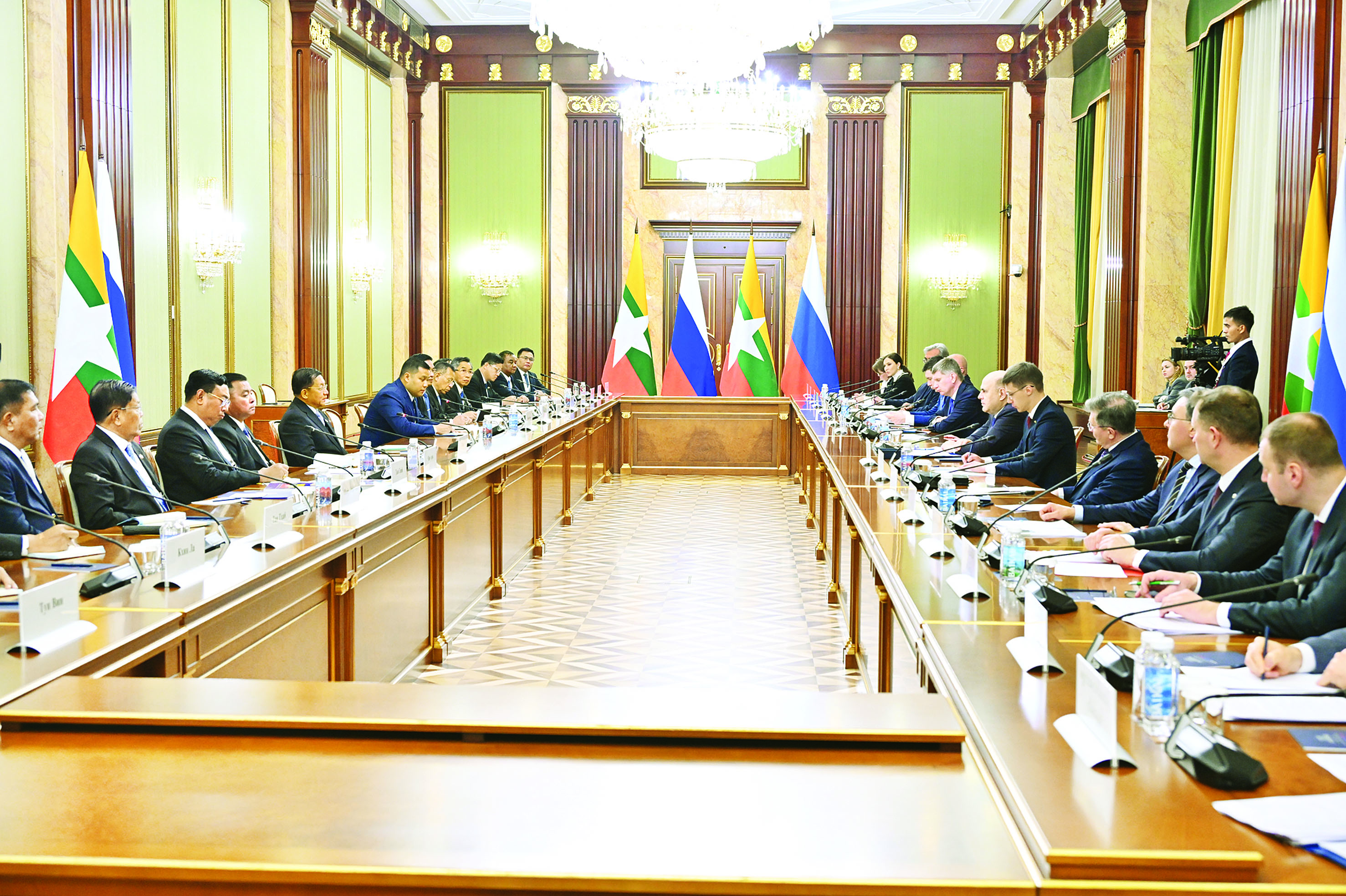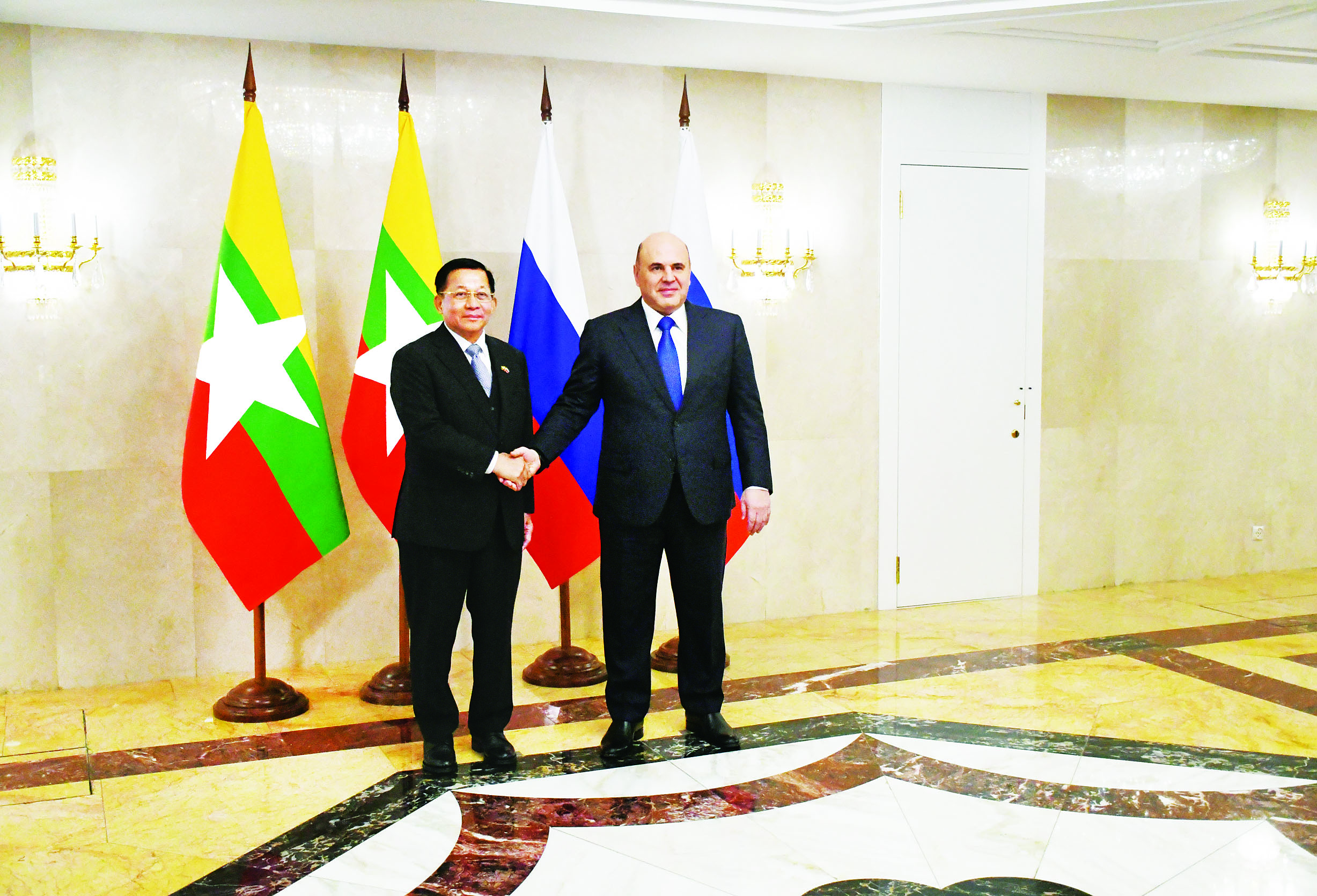 ရုရှားဖက်ဒရေးရှင်းနိုင်ငံ မော်စကိုမြို့၌ တရားဝင်ချစ်ကြည်ရေးခရီးရောက်ရှိနေသည့် နိုင်ငံတော်စီမံအုပ်ချုပ်ရေးကောင်စီ ဥက္ကဋ္ဌ နိုင်ငံတော်ဝန်ကြီးချုပ် ဗိုလ်ချုပ်မှူးကြီး မင်းအောင်လှိုင်သည် ယနေ့ဒေသစံတော်ချိန် မွန်းလွဲပိုင်းတွင် ရုရှားဖက်ဒရေးရှင်းနိုင်ငံအစိုးရအဖွဲ့ဝန်ကြီးချုပ် H.E. Mikhail Vladimirovich Mishustim နှင့် ရုရှားအစိုးရအဖွဲ့ အိမ်တော်အစည်းအဝေးခန်းမ၌ တွေ့ဆုံဆွေးနွေးသည်။