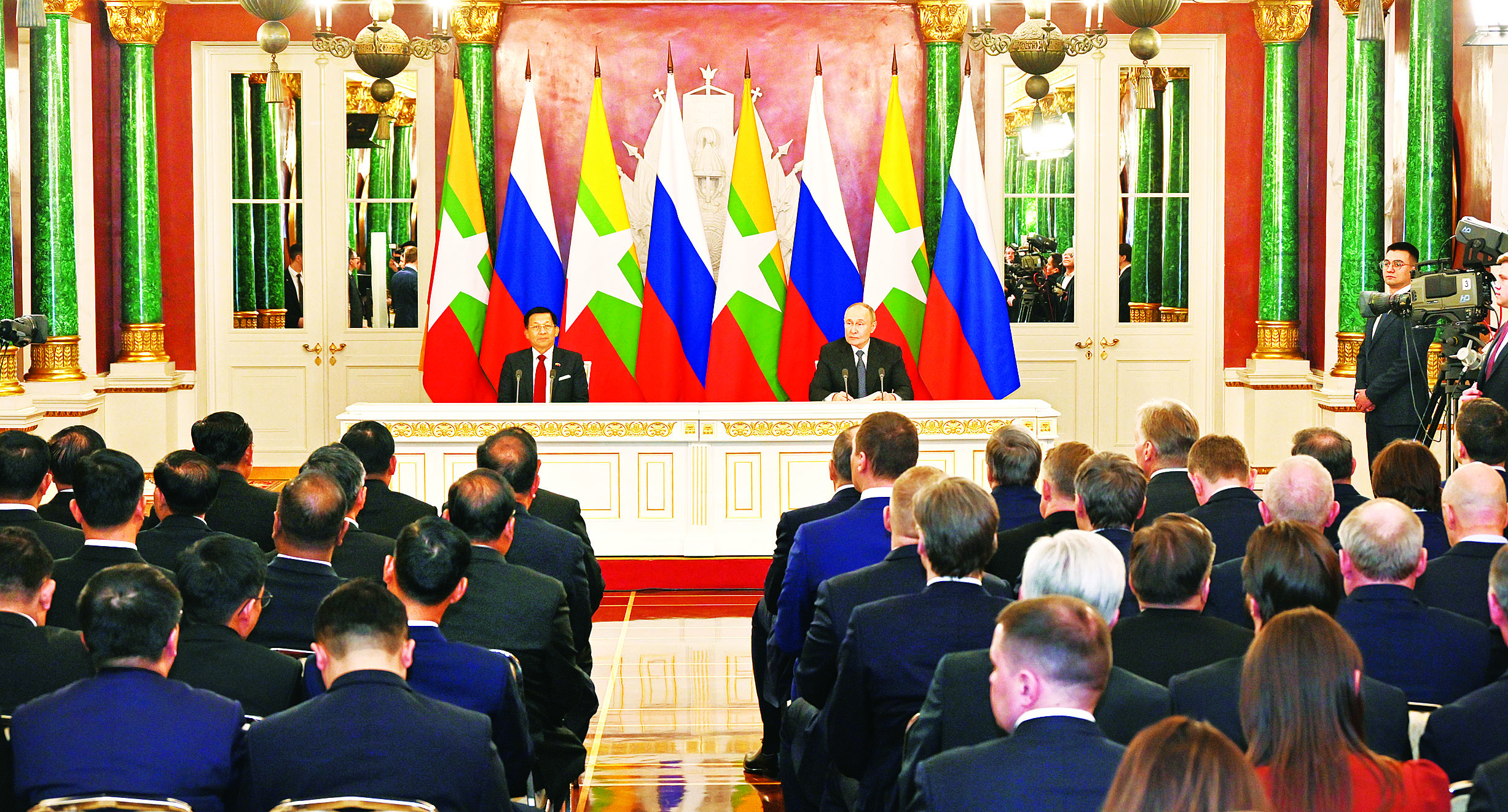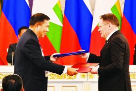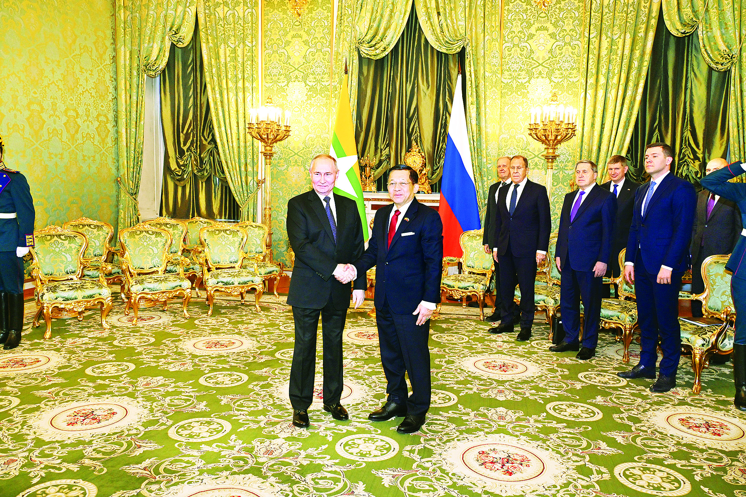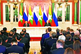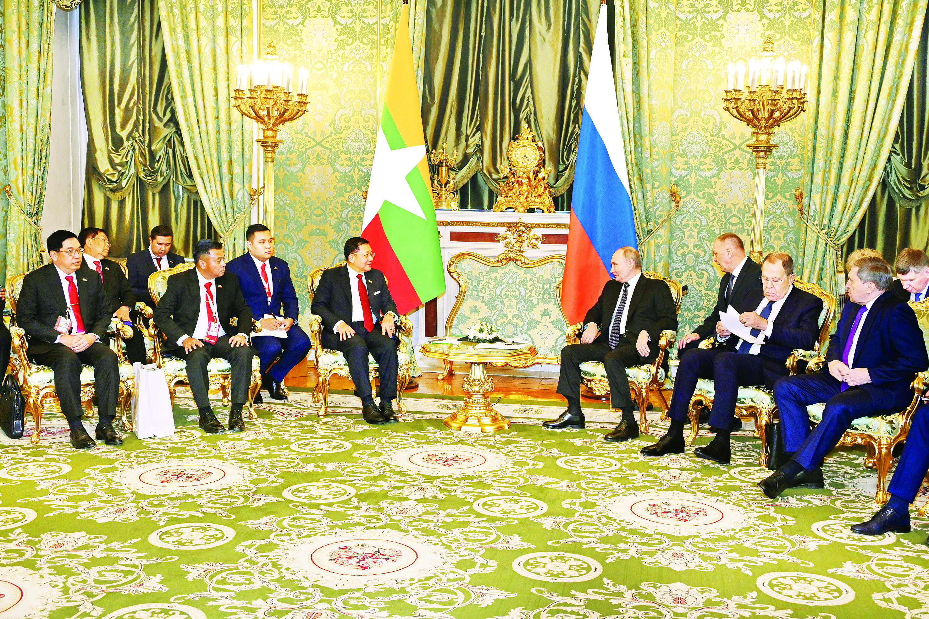 ရုရှားဖက်ဒရေးရှင်းနိုင်ငံသမ္မတ H.E. Vladimir Vladimirovich Putin ၏ ဖိတ်ကြားချက်အရ ရုရှားဖက်ဒရေးရှင်းနိုင်ငံသို့ တရားဝင်ချစ်ကြည်ရေးခရီးရောက်ရှိနေသည့် နိုင်ငံတော်စီမံအုပ်ချုပ်ရေးကောင်စီ ဥက္ကဋ္ဌ နိုင်ငံတော်ဝန်ကြီးချုပ် ဗိုလ်ချုပ်မှူးကြီး မင်းအောင်လှိုင်သည် ယနေ့ဒေသစံတော်ချိန် ညနေပိုင်းတွင် မော်စကိုမြို့ ကရင်မလင်နန်းတော်၌ ရုရှားဖက်ဒရေးရှင်းနိုင်ငံသမ္မတ H.E. Vladimir Vladimirovich Putin နှင့် သီးခြားတွေ့ဆုံဆွေးနွေးသည်။