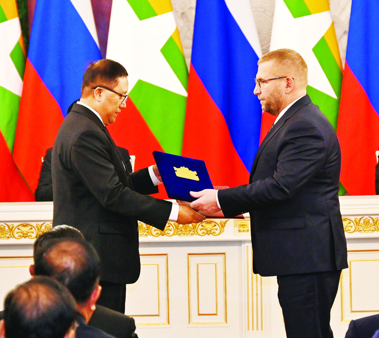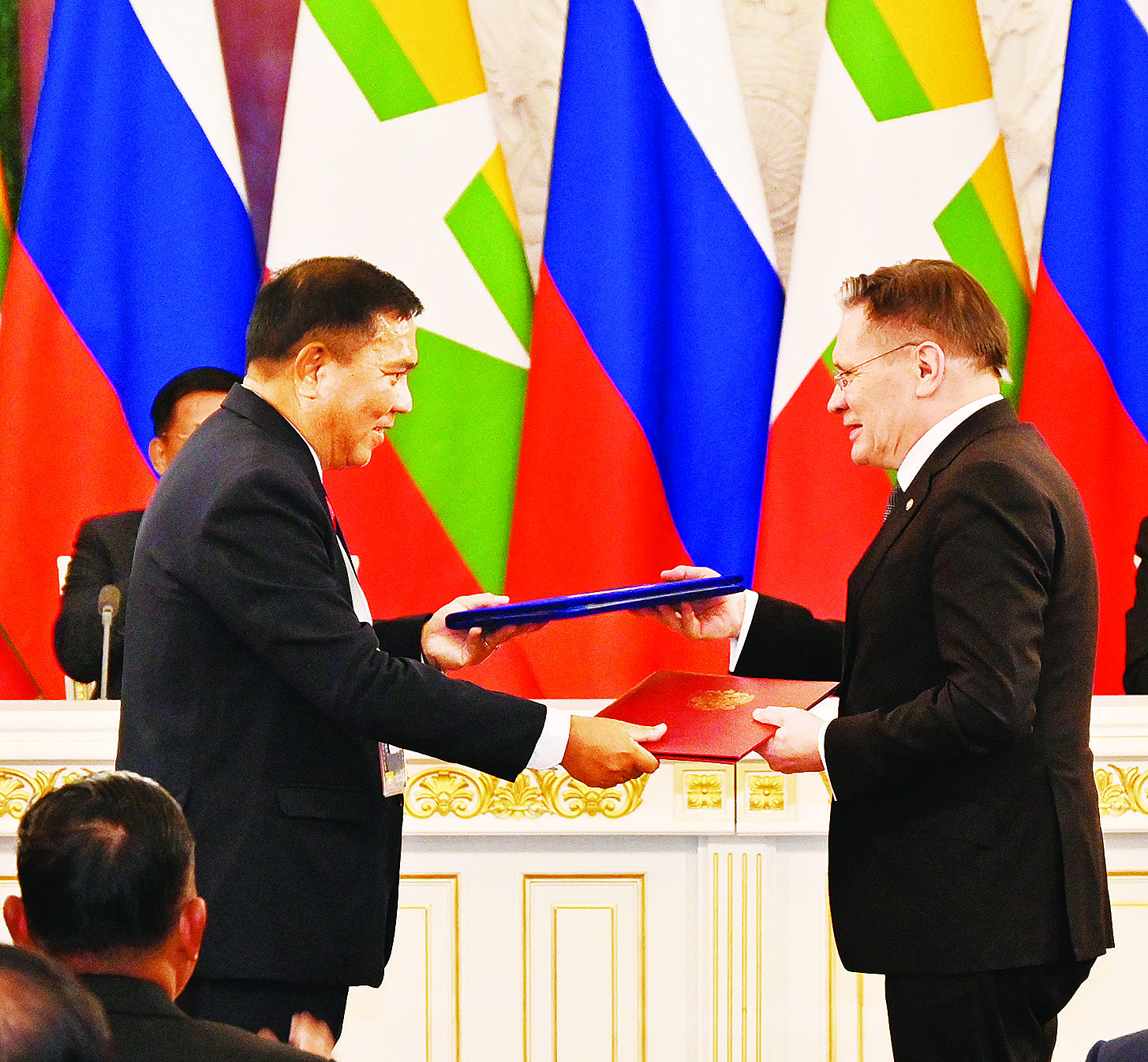 ယင်းနောက် နှစ်နိုင်ငံအစိုးရနှစ်ရပ်အကြား သဘောတူညီချက်များနှင့် နားလည်မှုစာချွန်လွှာများ လက်မှတ်ရေးထိုးလဲလှယ်ခြင်း အခမ်းအနားကို ဆက်လက်ကျင်းပပြုလုပ်ရာ နှစ်နိုင်ငံအကြား ပညာရေးအရည်အချင်း သတ်မှတ်ချက်နှင့် ပညာရပ်ဆိုင်ရာဘွဲ့၊ ဒီဂရီများ အပြန်အလှန်အသိအမှတ်ပြုရေးဆိုင်ရာ သဘောတူစာချုပ်၊ အကောက်အခွန်ဆိုင်ရာ ကိစ္စရပ်များဆိုင်ရာ သဘောတူညီချက်များ၊ ကျန်းမာရေးဆိုင်ရာ နားလည်မှုစာချွန်လွှာများ၊ ယဉ်ကျေးမှုနှင့် အားကစားကဏ္ဍတွင် ပူးပေါင်းဆောင်ရွက်ခြင်း စာချွန်လွှာများ၊ အဏုမြူစွမ်းအင်ကို ငြိမ်းချမ်းစွာအသုံးပြုရာတွင် နျူကလီးယားနှင့် ဓာတ်ရောင်ခြည်ဘေးအန္တရာယ် ကင်းရှင်းရေး စည်းမျဉ်းဥပဒေနယ်ပယ်၌ ပူးပေါင်းဆောင်ရွက်ရေး နားလည်မှုစာချွန်လွှာများ၊ ဘူမိဗေဒလေ့လာရေးနှင့် ဓာတ်သတ္တုရှာဖွေရေးဆိုင်ရာ စီးပွားရေးနှင့်နည်းပညာ ပူးပေါင်းဆောင်ရွက်ရေး နားလည်မှုစာချွန်လွှာများ၊ ငြိမ်းချမ်းသောရည်ရွယ်ချက်ဖြင့် ပြင်ပအာကာသစူးစမ်းလေ့လာရေးနှင့် အသုံးပြုမှုနယ်ပယ်တွင် ပူးပေါင်းဆောင်ရွက်ရေး နားလည်မှုစာချွန်လွှာနှင့် နှစ်နိုင်ငံအကြား ရင်းနှီးမြှုပ်နှံမှုများမြှင့်တင်ရေးနှင့် အကာအကွယ်ပေးရေးဆိုင်ရာ သဘောတူညီချက်စာချုပ် (မူကြမ်း) အပေါ် ဆွေးနွေးညှိနှိုင်းမှု အောင်မြင်စွာပြီးမြောက်ခြင်းနှင့် စပ်လျဉ်း၍ ပူးတွဲကြေညာချက်တို့အား ရုရှားဖက်ဒရေးရှင်းနိုင်ငံဆိုင်ရာ မြန်မာနိုင်ငံသံအမတ်ကြီးနှင့် သက်ဆိုင်ရာပြည်ထောင်စုဝန်ကြီးများက ရုရှားဖက်ဒရေးရှင်းနိုင်ငံဘက်မှ သက်ဆိုင်ရာဝန်ကြီးများ၊ တာဝန်ရှိသူများနှင့် နိုင်ငံတော်စီမံအုပ်ချုပ်ရေးကောင်စီ ဥက္ကဋ္ဌ နိုင်ငံတော်ဝန်ကြီးချုပ်နှင့် ရုရှာ ဖက်ဒရေးရှင်းနိုင်ငံသမ္မတတို့ရှေ့မှောက်၌ အသီးသီး လက်မှတ်ရေးထိုးလဲလှယ်ခဲ့ကြသည်။