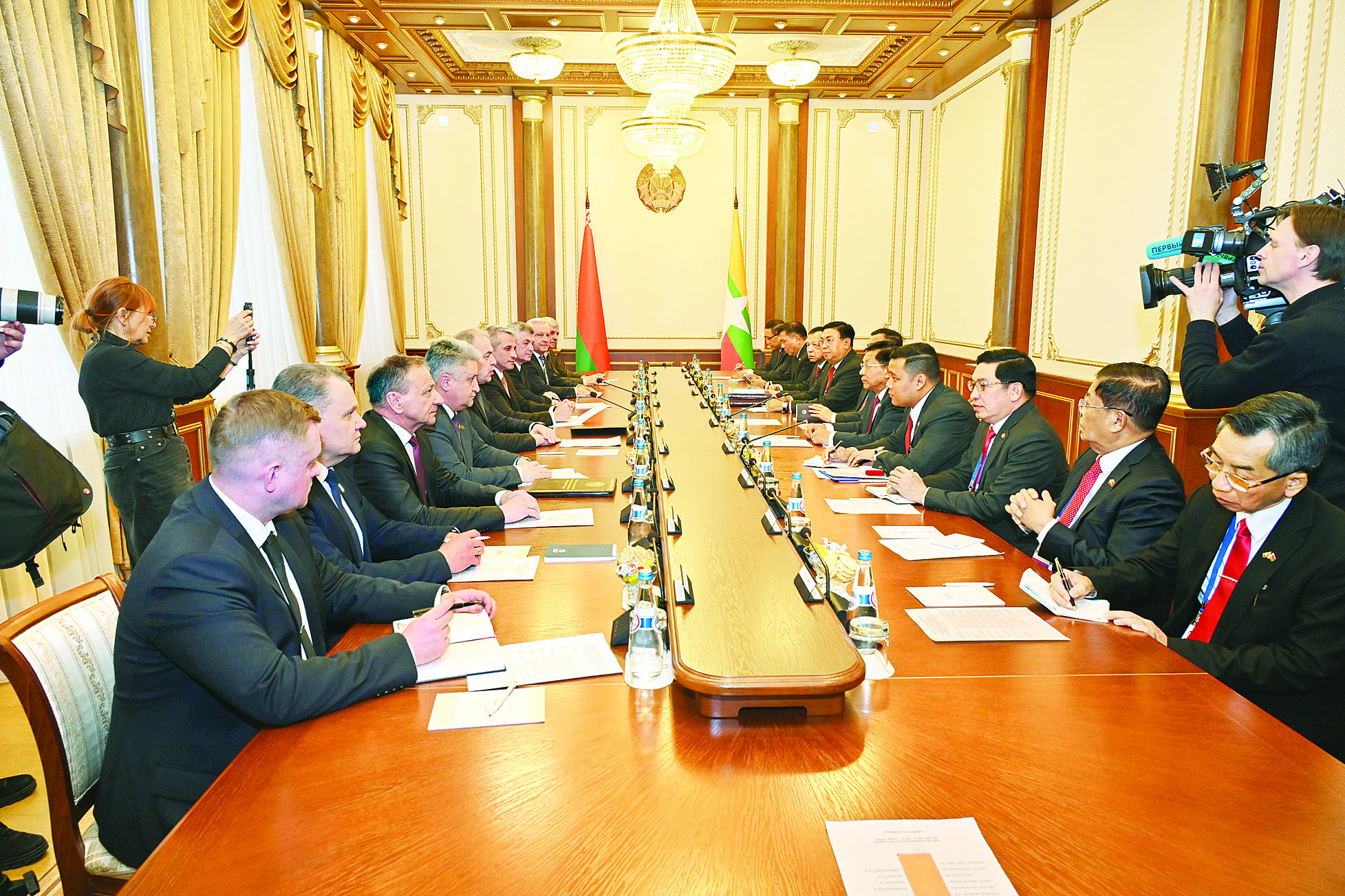 ဘယ်လာရုစ်သမ္မတနိုင်ငံ၊ မင့်စ်မြို့၌ နိုင်ငံတော်အဆင့်ချစ်ကြည်ရေးခရီး ရောက်ရှိနေသည့် နိုင်ငံတော်စီမံအုပ်ချုပ်ရေးကောင်စီ ဥက္ကဋ္ဌ နိုင်ငံတော်ဝန်ကြီးချုပ် ဗိုလ်ချုပ်မှူးကြီး မင်းအောင်လှိုင်သည် ယနေ့ ဒေသစံတော်ချိန် မွန်းလွဲပိုင်းတွင် ဘယ်လာရုစ်နိုင်ငံ အမျိုးသားလွှတ်တော်ဥက္ကဋ္ဌ H.E. Mr. Igor Petrovich Sergeenko နှင့် မင့်စ်မြို့ရှိ အမျိုးသားလွှတ်တော်၌ တွေ့ဆုံဆွေးနွေးသည်။