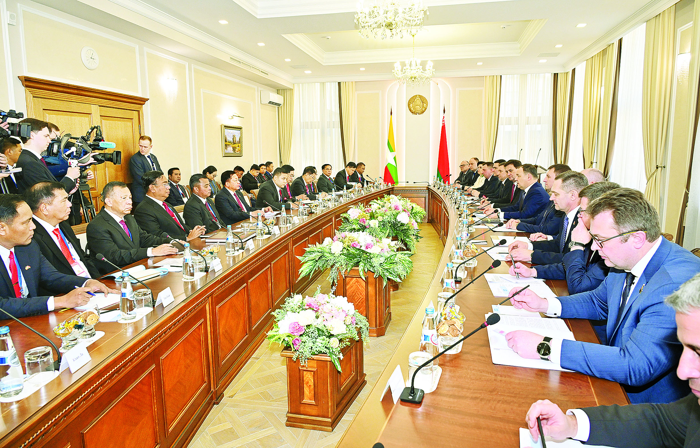 ထိုသို့တွေ့ဆုံရာတွင် နိုင်ငံတော်စီမံအုပ်ချုပ်ရေးကောင်စီ ဥက္ကဋ္ဌ နိုင်ငံတော်ဝန်ကြီးချုပ်၏ ဘယ်လာရုစ်နိုင်ငံသို့ လာရောက်သည့် ချစ်ကြည်ရေးခရီးစဉ်သည် နှစ်နိုင်ငံ ချစ်ကြည်ရင်းနှီးမှုနှင့် ပူးပေါင်းဆောင်ရွက်မှုများကို များစွာမြှင့်တင်ပေးနိုင်မှု အခြေအနေများ၊ မြန်မာ-ဘယ်လာရုစ် စီးပွားရေးဖိုရမ် အောင်မြင်စွာကျင်းပနိုင်ခဲ့မှုနှင့် နှစ်နိုင်ငံအကြား နားလည်မှုစာချွန်လွှာများ လက်မှတ်ရေးထိုးနိုင်ခဲ့သည့် အခြေအနေများ၊ နှစ်နိုင်ငံအကြား ထုတ်ကုန်ပစ္စည်းများ အပြန်အလှန်တင်ပို့နိုင်ရေးကိစ္စရပ်များ၊ မြန်မာနိုင်ငံမှထွက်ရှိသည့် ဆန်အပါအဝင် အခြားစက်မှုကုန်ကြမ်း သီးနှံများအား ဘယ်လာရုစ်နိုင်ငံသို့ တင်ပို့နိုင်ရေးဆိုင်ရာ ကိစ္စရပ်များ၊ စိုက်ပျိုးမွေးမြူရေးလုပ်ငန်းများအတွက် ရေခံမြေခံကောင်းများရှိပြီးဖြစ်သည့် မြန်မာနိုင်ငံနှင့် ခေတ်မီစိုက်ပျိုးမွေးမြူရေးနည်းပညာများ ပိုင်ဆိုင်ထားသည့် ဘယ်လာရုစ်နိုင်ငံတို့အကြား ပူးပေါင်းဆောင်ရွက်ခြင်းဖြင့် နှစ်နိုင်ငံအကျိုးဖြစ်ထွန်းစေမည့် ကိစ္စရပ်များ၊ စိုက်ပျိုးရေးနှင့် မွေးမြူရေးလုပ်ငန်းများတွင် နည်းပညာများ ဖလှယ်ရေးဆိုင်ရာကိစ္စရပ်များ၊ လျှပ်စစ်စွမ်းအင်သုံးမော်တော်ယာဉ်များ ထုတ်လုပ်ရေးတွင် ပူးပေါင်းဆောင်ရွက်ရေး ဆိုင်ရာကိစ္စရပ်များနှင့် အခြားနှစ်နိုင်ငံအကြား ချစ်ကြည်ရင်းနှီးမှုနှင့် ပူးပေါင်းဆောင်ရွက်မှုများ မြှင့်တင်ရေးဆိုင်ရာ ကိစ္စရပ်များအား ရင်းနှီးပွင့်လင်းစွာဖြင့် အမြင်ချင်းဖလှယ်ဆွေးနွေးခဲ့ကြကြောင်း သတင်းရရှိသည်။