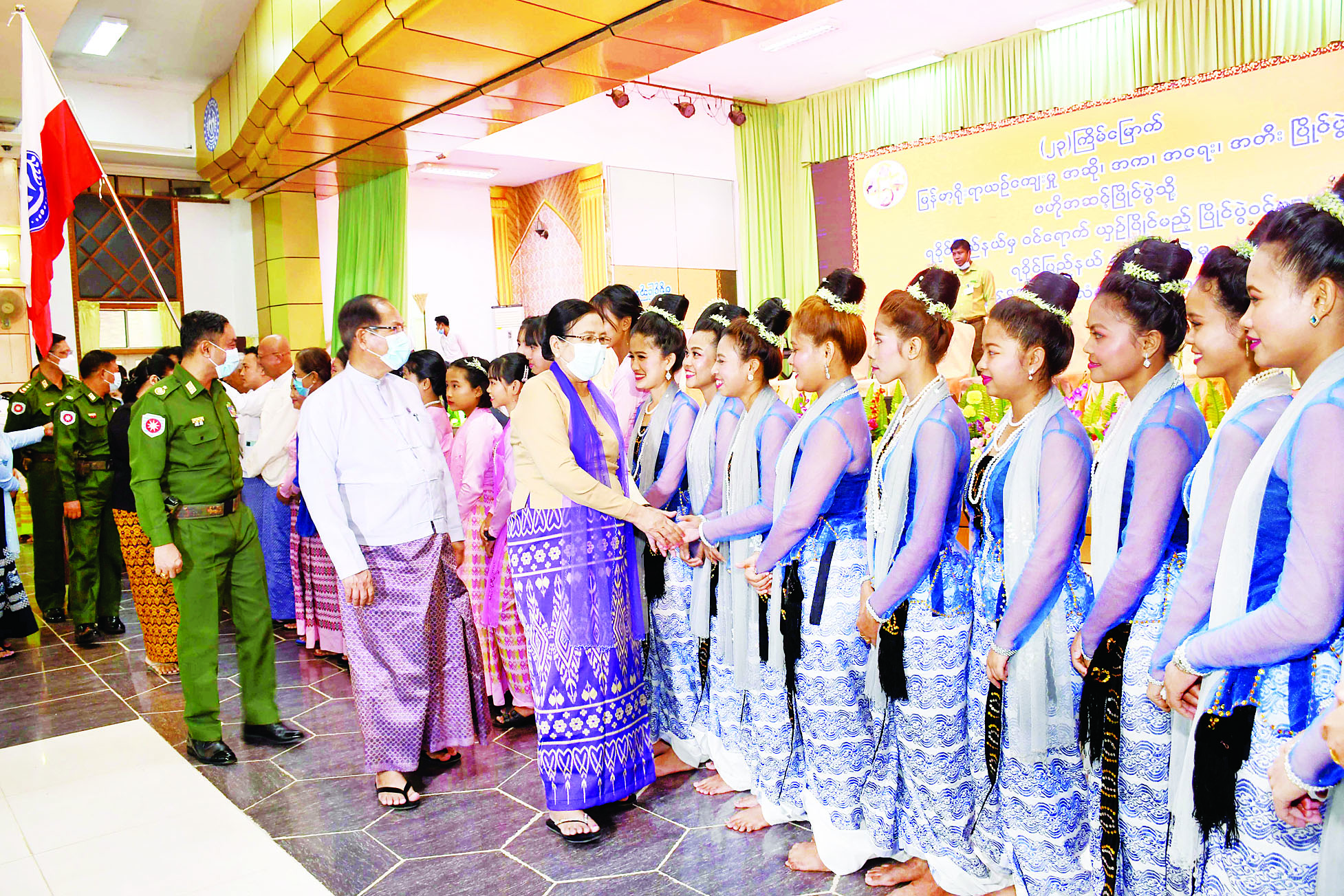 (၂၃) ကြိမ်မြောက် မြန်မာ့ရိုးရာ အဆို၊ အက၊ အရေး၊ အတီးပြိုင်ပွဲ တွင် ရခိုင်ပြည်နယ်မှ သွားရောက် ယှဉ်ပြိုင်မည့် ပြိုင်ပွဲဝင်များအား အောင်နိုင်ရေးအလံ ပေးအပ်ပွဲ အခမ်းအနားကို ယနေ့နံနက်ပိုင်း က စစ်တွေမြို့ ဦးဥတ္တမခန်းမ၌ ကျင်းပရာ နိုင်ငံတော်စီမံအုပ်ချုပ် ရေးကောင်စီအဖွဲ့ဝင် ဒေါ်အေးနုစိန်၊ ရခိုင်ပြည်နယ် ဝန်ကြီးချုပ် ဒေါက်တာ အောင်ကျော်မင်း၊ အနောက်ပိုင်းတိုင်း စစ်ဌာနချုပ် တိုင်းမှူး ဗိုလ်ချုပ် ထင်လတ်ဦး၊ ပြည်နယ် တရားလွှတ်တော် တရားသူကြီးချုပ် ဒေါ်ဝါဝါထွန်း၊ ပြည်နယ် အစိုးရအဖွဲ့ဝင်များ၊ ဌာနဆိုင်ရာများနှင့် ပြိုင်ပွဲဝင်များ တက်ရောက်ကြသည်။