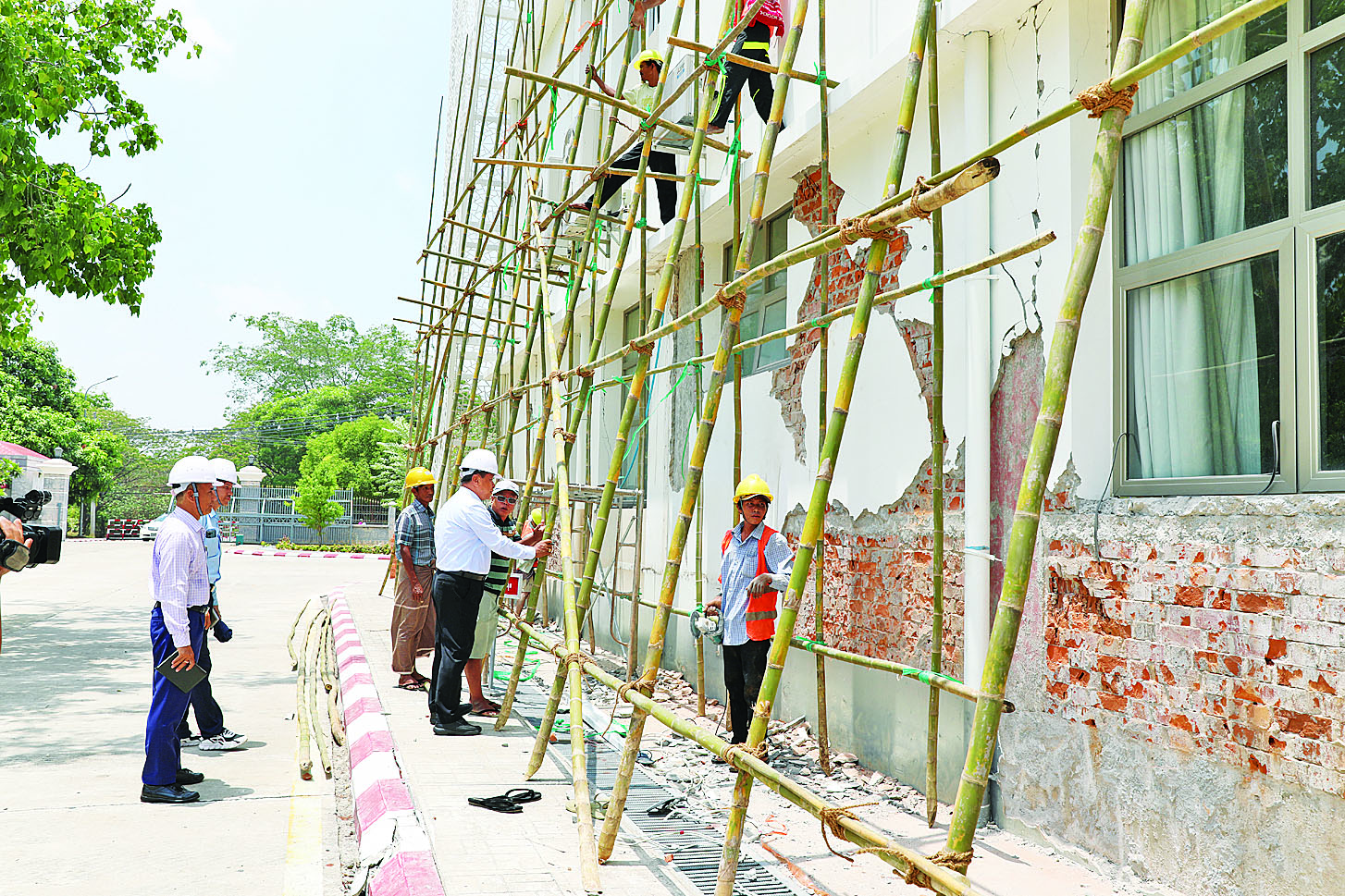 ရှေးဦးစွာ ဒုတိယဝန်ကြီးချုပ် ဗိုလ်ချုပ်ကြီးတင်အောင်စန်းသည် တာဝန်ရှိသူများနှင့်အတူ အင်အား ပြင်း မြေငလျင်လှုပ်ခတ်မှုကြောင့် ထိခိုက်ပျက်စီးခဲ့သည့် နိုင်ငံတော်စီမံအုပ်ချုပ်ရေးကောင်စီရုံး အဆောက်အအုံ ပြန်လည်ပြုပြင်ဆောင်ရွက်နေမှုများကို ကြည့်ရှုစစ်ဆေးရာ တာဝန်ရှိသူများက အဆောက်အအုံ ထိခိုက်ပျက်စီးခဲ့မှုအခြေအနေများ၊ ပြန်လည်ပြုပြင်ဆောင်ရွက်မည့် အခြေအနေ များ ရှင်းလင်းတင်ပြမှုအပေါ် ဒုတိယဝန်ကြီးချုပ်က ငလျင်ဒဏ်သင့်အဆောက်အအုံများ ပြုပြင် ရေးဆောင်ရွက်ရာတွင် လုပ်ငန်းခွင်ဘေးအန္တရာယ်ကင်းရှင်းရေးအတွက် အထူးအလေးထား ဆောင်ရွက်ရန်၊ အဆောက်အအုံများအား သတ်မှတ်ထားသည့် SOP နှင့်အညီ ရေရှည်ခိုင်ခံ့မှု အတွက် ပြုပြင်တည်ဆောက်ရန် မှာကြားခဲ့သည်။