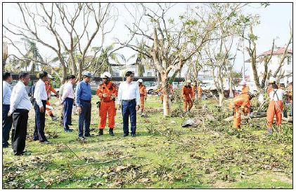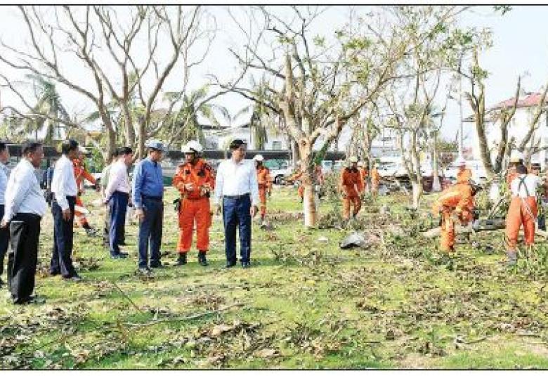 ရခိုင်ပြည်နယ်အတွင်း မုန်တိုင်းဒဏ်ကြောင့်ပျက်စီးဆုံးရှုံးမှုများအား ပြန်လည်ထူထောင်ရေးလုပ်ငန်းများကို အနီးကပ်ကြီးကြပ်ကွပ်ကဲရန်စစ်တွေမြို့၌ ရောက်ရှိနေသော နိုင်ငံတော်စီမံအုပ်ချုပ်ရေးကောင်စီအဖွဲ့ဝင် ဒုတိယဝန်ကြီးချုပ်နှင့် ပို့ဆောင်ရေးနှင့်ဆက်သွယ်ရေးဝန်ကြီးဌာန ပြည်ထောင်စုဝန်ကြီးဗိုလ်ချုပ်ကြီး တင်အောင်စန်းနှင့် နယ်စပ်ရေးရာဝန်ကြီးဌာန ပြည်ထောင်စုဝန်ကြီး ဒုတိယဗိုလ်ချုပ်ကြီးထွန်း ထွန်းနောင်တို့သည် ရခိုင်ပြည်နယ်ဝန်ကြီးချုပ် ဦးထိန်လင်းနှင့်အတူ ယနေ့နံနက်ပိုင်းတွင် ပြည်နယ်အစိုးရအဖွဲ့ဧည့်ရိပ်သာ၌ မုန်တိုင်းကြောင့်ပြိုလဲနေသော သစ်ပင်သစ်ကိုင်းများအား မြန်မာနိုင်ငံရဲတပ်ဖွဲ့ဝင်များနှင့် မြန်မာနိုင်ငံမီးသတ်တပ်ဖွဲ့ဝင်များက ရှင်းလင်းဆောင်ရွက်နေခြင်း ကို ကြည့်ရှုစစ်ဆေးပြီး လိုအပ်သည်များ မှာကြားသည်။
