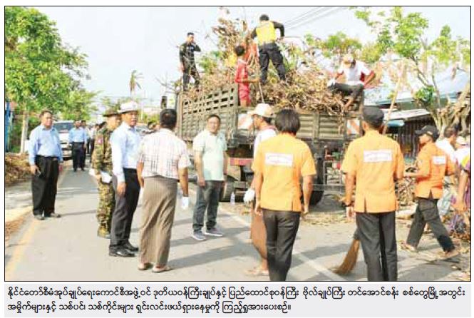 ဦးစွာ ဗိုလ်ချုပ်ကြီးတင်အောင် စန်းနှင့်အဖွဲ့သည် စစ်တွေမြို့ ကျောင်းကြီးလမ်း ရပ်ကွက်ကျောင်းကြီးလမ်းနှင့် မင်းဘာကြီး လမ်းဘေးဝဲယာ တစ်လျှောက်ရှိ အမှိုက်များနှင့် သစ်ပင်၊ သစ်ကိုင်း များအား မြန်မာနိုင်ငံရဲတပ်ဖွဲ့၊ မီးသတ်တပ်ဖွဲ့၊ ဌာနဆိုင်ရာ ဝန်ထမ်းများ၊ လူမှုကူညီရေး အသင်းအဖွဲ့များနှင့် ရပ်ကွက်နေ ပြည်သူ စုစုပေါင်းအင်အား ၆၀၀ ကျော်ဖြင့် ခုတ်ထွင်ရှင်းလင်း ဖယ်ရှားနေမှုကို သွားရောက် ကြည့်ရှုအားပေးပြီး မြို့ရွာသန့်ရှင်း သာယာရေး ဝိုင်းဝန်းပူးပေါင်း ဆောင်ရွက်သွားကြရန်၊ မကြာမီ မိုးရာသီရောက်ရှိတော့မည်ဖြစ်သဖြင့် ရေစီးရေလာကောင်း မွန်စေ ရေးအတွက် ရေမြောင်းများကိုပါ တစ်ပါတည်း ရှင်းလင်းကြရန် တာဝန်ရှိသူများကို မှာကြားသည်။
